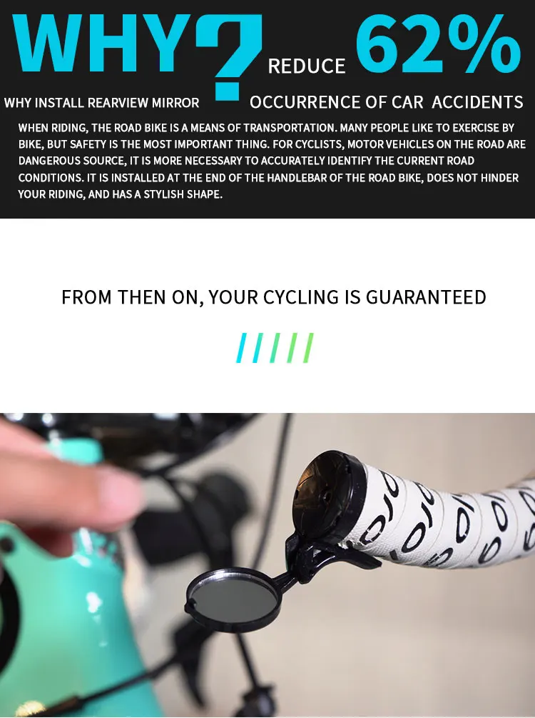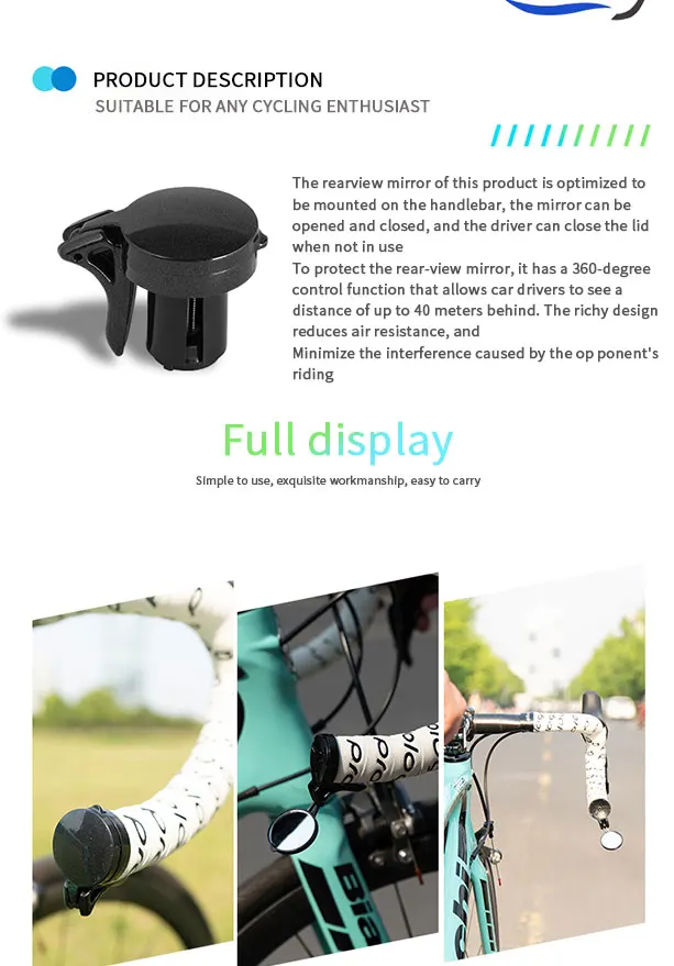 Особенности: 1. Угол вращения: Поворот на 360 градусов. 2. Функция зеркала: зеркало можно открыть или закрыть. 3. Портативный: легкий и маленький размер. 4. Простая установка: легко установить на руль велосипеда. 5. Безопасное вождение: прозрачная зеркальная поверхность, делает езду более безопасной. Характеристики: Описание: Подходящая Ручка: 21-22 мм/0,82-0,86 дюйма Цвет: черный Материал: акрил + Поликарбонат Посылка включает в себя: 1 X зеркало заднего вида