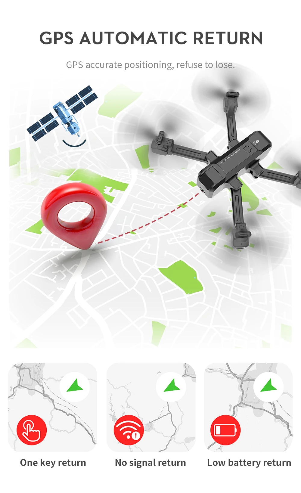 1. GPS возврат одной кнопкой для точки снятия, возврат домой с низкой мощностью, возврат домой без сигнала.