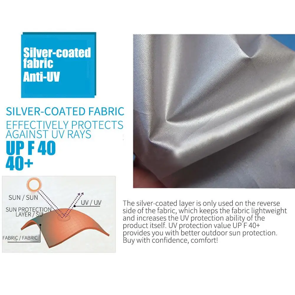 1. Поверхность изготовлена из полиэстера 170T с серебряным покрытием, защита от ультрафиолета до 40 +, а нижняя часть из качественного полиэстера 210D oxford, прочного и долговечного.