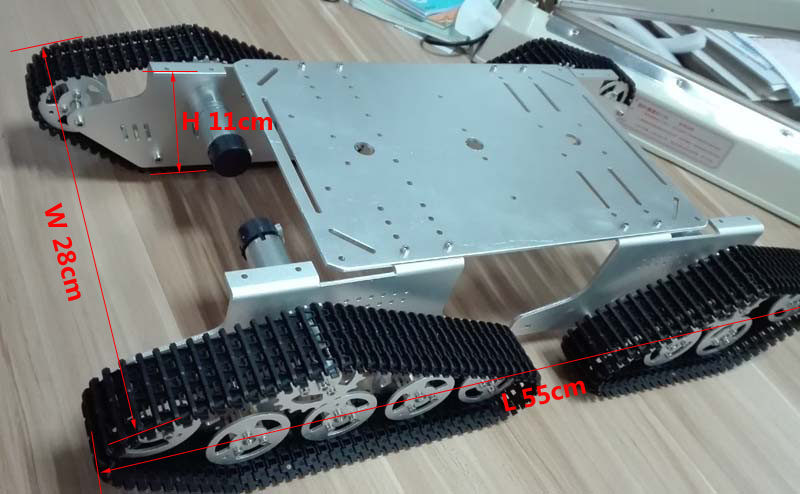 Название: T900 умный Танк шасси Материал: алюминиевый сплав Обработка поверхности: пескоструйное окисление Размеры: около 550*280*110 мм (длина * ширина * высота) Цвет: серебристый, золотой Гусеничный: инженерный пластик Привод колеса: алюминиевый сплав Подшипника ступицы колеса: алюминиевый сплав Двигатель: высокий крутящий момент 9 вольтового источника электропитания постоянного тока Вес: 3,8 кг Тяжелая нагрузка