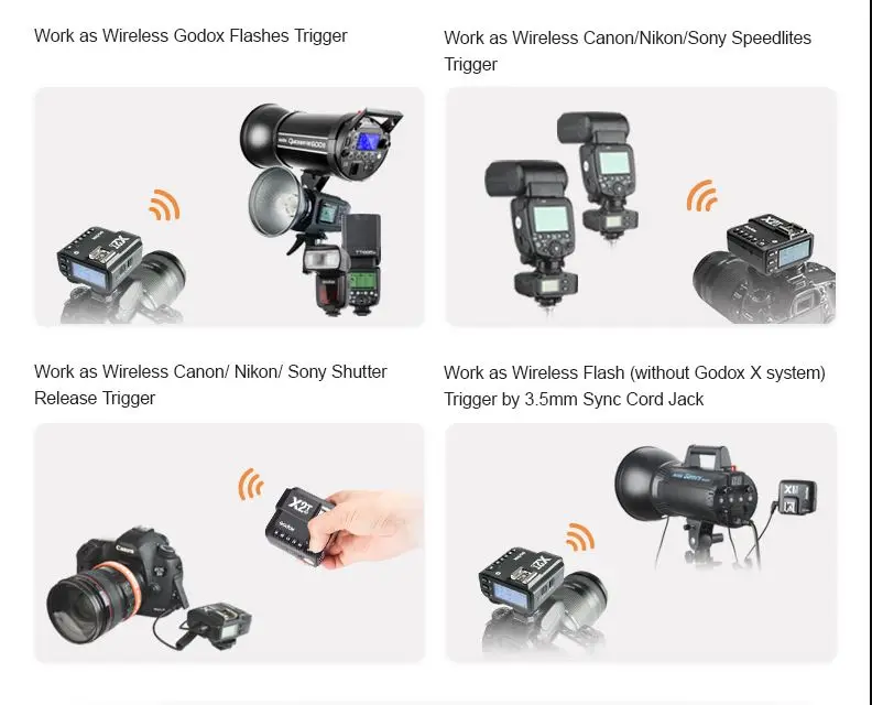 Совместимость: X2T-C для камер Canon; X2T-N для камер Nikon; X2T-S для камер Sony; X2T-F для камер Fujifilm; X2T-O для камер Olympus и Panasonic и X2T-P для камер Pentax.