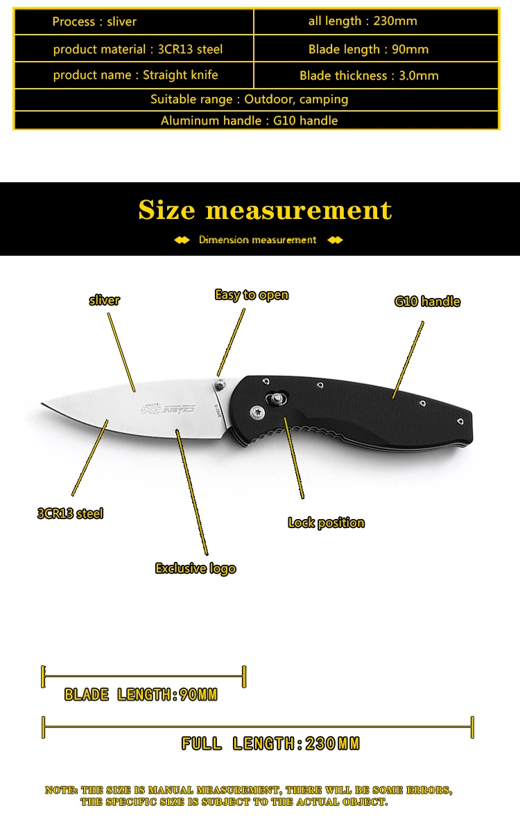 Ype: складной нож Длина: 230 мм Длина лезвия: 90 мм Толщина: 2,5 мм Материал ручки: G10 Материалы: 7CR15MOV Твердость: 57-58HRC Вес: 210 г