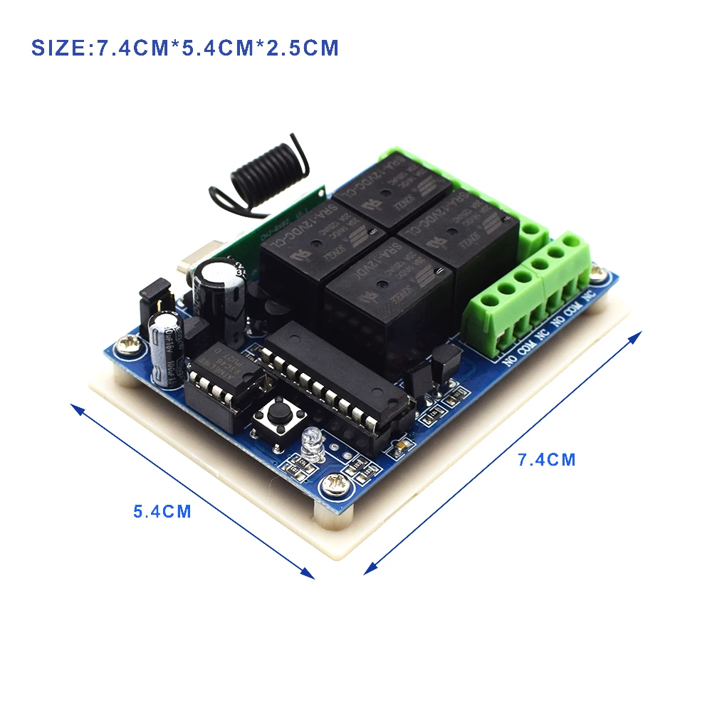 Working voltage DC12V Static working current ≤7mA Working temperature -40℃ - +80℃ Receiving sensitive ≥-105dBm Working frequency 315MHz、433MHz Output voltage alternating current or direct current Output current ≤10A Size 74.5mm*54.5mm*27.5mm