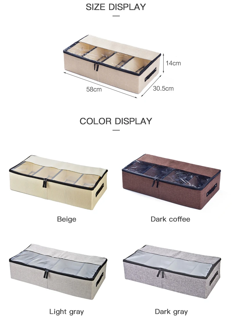 Material: cloth Size:58*30*14cm Color: 4 colors Package Included: 1 * shoe storage box