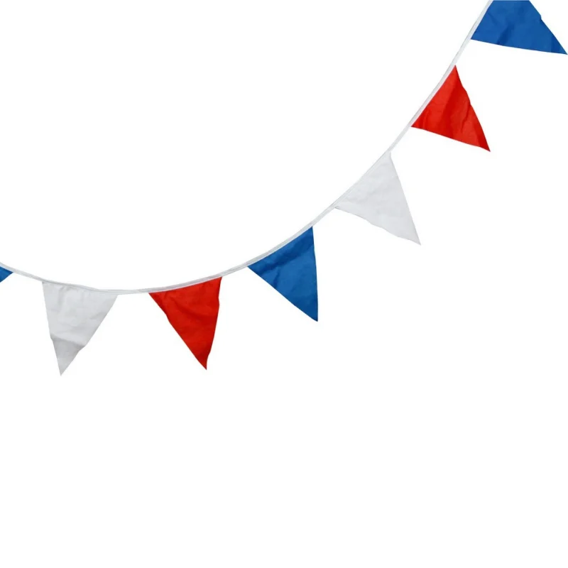 Product Description: Product Name:Tricolor cotton triangle flag Quantity:1pc Color:As Pictures Show Size:15cm * 19cm * 19cm Features: 1. A length of 10m and weight of about 50g 2. Single side Pennant size: three sides 15cm * 19cm * 19cm, height 17.46cm 3. Material: Chunya textile 4. Color: white, blue, red, quantity: 1pc with 20 flags 5. Used for wedding sign in desk, outdoor wedding, children's room, festival day, baby photo background decoration, kindergarten decoration, etc Package Included: 1 x Tricolor cotton triangle flag