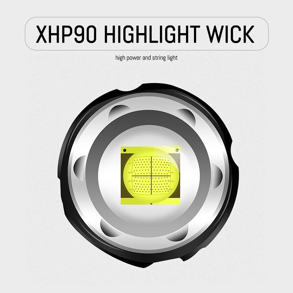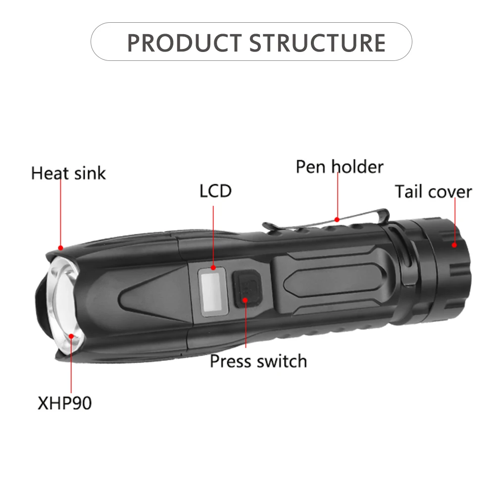 Powerful XHP90 LED Flashlight Lamp Zoom Torch USB Rechargeable XHP90 Tactical Light Camping Hunting Lamp Flash Light Torch Lamp Brand: Asafee Model: W69B XHP90 LED Flashlight Lamp Zoom Torch Lamp: XHP90 LED Product size: 16 * 4.5 * 4CM White box size: 18.5 * 6.5 * 6.5 cm Net weight: 242G Gross weight: 262g Material: Aluminum alloy Switch: Press the switch, long press to turn on-long press to turn off Battery: 1 * 26650 (not included) Charging method: micro USB charging, support power output, 5V, 1A Gear: 6 gears: low light-medium light-strong light-flash, double-click: super bright-SOS, long press for 3 seconds to shut down Zoom method: Telescopic zoom Features: tail with safety hammer with pen clip Lumens: Low light -200 lumens. Medium light -500 lumens. Strong light -1200 lumens, Super bright -2200 lumens Low voltage automatic power-off mode, OLED intelligent digital display, display gear, voltage, power and lumen Package contents: Package A 1* XHP90 LED Flashlight Lamp Zoom Torch Flashlight 1*Micro USB Cable 1 *26650 Battery 1* charger Package B 1* XHP90 LED Flashlight Lamp Zoom Torch Flashlight 1*Micro USB Cable 1*26650 Battery 1* charger 1*Car charger Package C 1* XHP90 LED Flashlight Lamp Zoom Torch Flashlight 1*Micro USB Cable 1 *26650 Battery 1* charger 1*Car charger 1*Wall plug charger 1*ABS Gift Box