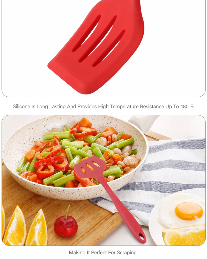 ЭтоМосотоСиликоновый шлицевой ТернерПредназначен для большего контроля при подъеме и повороте готовой пищи. Тернер изготовлен из прочного силикона. Щелевой Тернер безопасен для использования на всей кухонной утвари, включая антипригарный и термостойкий до 480 F. Короткая ручка дает больше контроля при повороте пищи. Удобное подвесное отверстие обеспечивает сохранение пространства. Посудомоечная машина безопасна для легкой очистки.