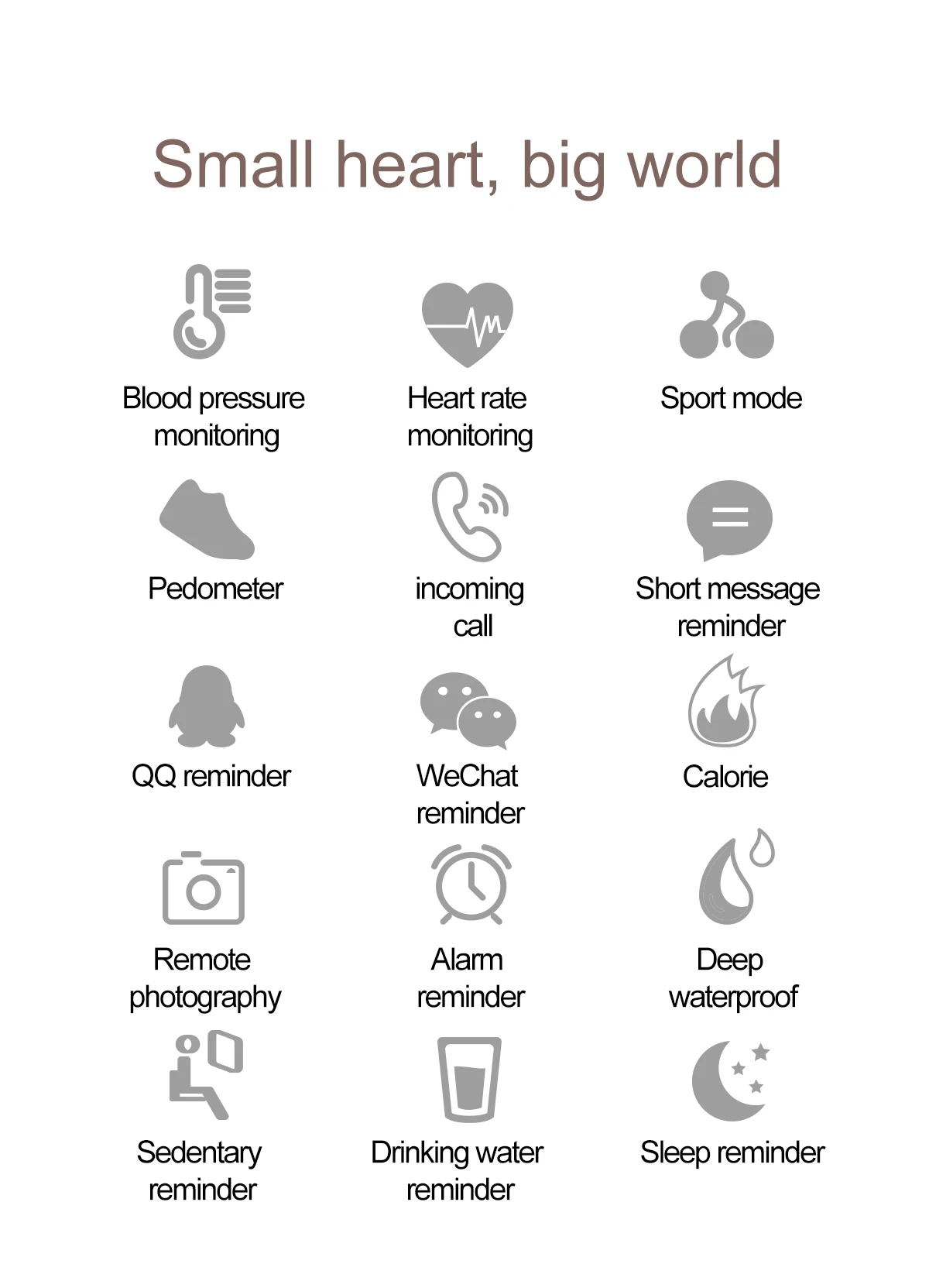 Смарт-часы трекер активности для мужчин водонепроницаемые Смарт-часы для женщин монитор сердечного ритма фитнес-трекер Смарт-браслет Примечание: 1. Принцип измерения Носимых устройств полностью отличается от принципа измерения медицинского оборудования. Это только для занятий спортом и фитнесом, спасибо. 2. Пожалуйста, загрузите приложение перед использованием. Основная особенность: Отображение спортивных данных ● Для управления здоровьем, сохраняя данные в течение 30 дней. Шагомер, поддержка времени занятий спортом, расчет калорий, мониторинг сна. Монитор сердечного ритма ● Функция монитора сердечного ритма HRM в режиме реального времени. (Данные только для справки) Измерение артериального давления и кислорода ● Изделие может указывать ваше физическое состояние во все времена и места. (Данные только для справки) Спортивные режимы ● Ходьба, бег, езда на велосипеде, баскетбол, плавание, настольный теннис, баминтон, альпинизм, футбол. Напоминание ● Поддержка сигнализации, питья воды, сидения, звонков, SMS (сообщения, QQ, Wechat, Skype, Facebook, Twitter, Line, Whatsapp), напоминания о потере. Часы будут напоминать вам вибрацией. (вам нужно открыть соответствующее напоминание в мобильном приложении) Прочие Функции ● Время, удаленная камера, найти браслет, шагомер, вибрационное напоминание, анти-потеря, расчет расстояния Язык приложения ● Китайский, английский, японский, корейский, испанский, немецкий, итальянский, французский, греческий, русский, голландский, португальский. Умный Браслет ● Китайский, английский. Приложение ● Найдите «FunDo» в app Store или отсканируйте qr-код и загрузите «FunDo»