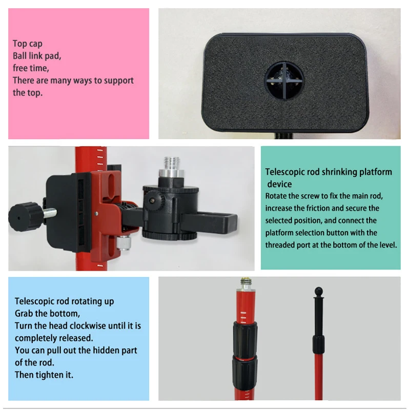 Метод: телескопический Совместимость: 1/4 или 5/8 Резьбовая линия лазера Регулируемый диапазон подъема: 101 ~ 400 см Вес: 2,6 кг Размеры: 105x12x12 см