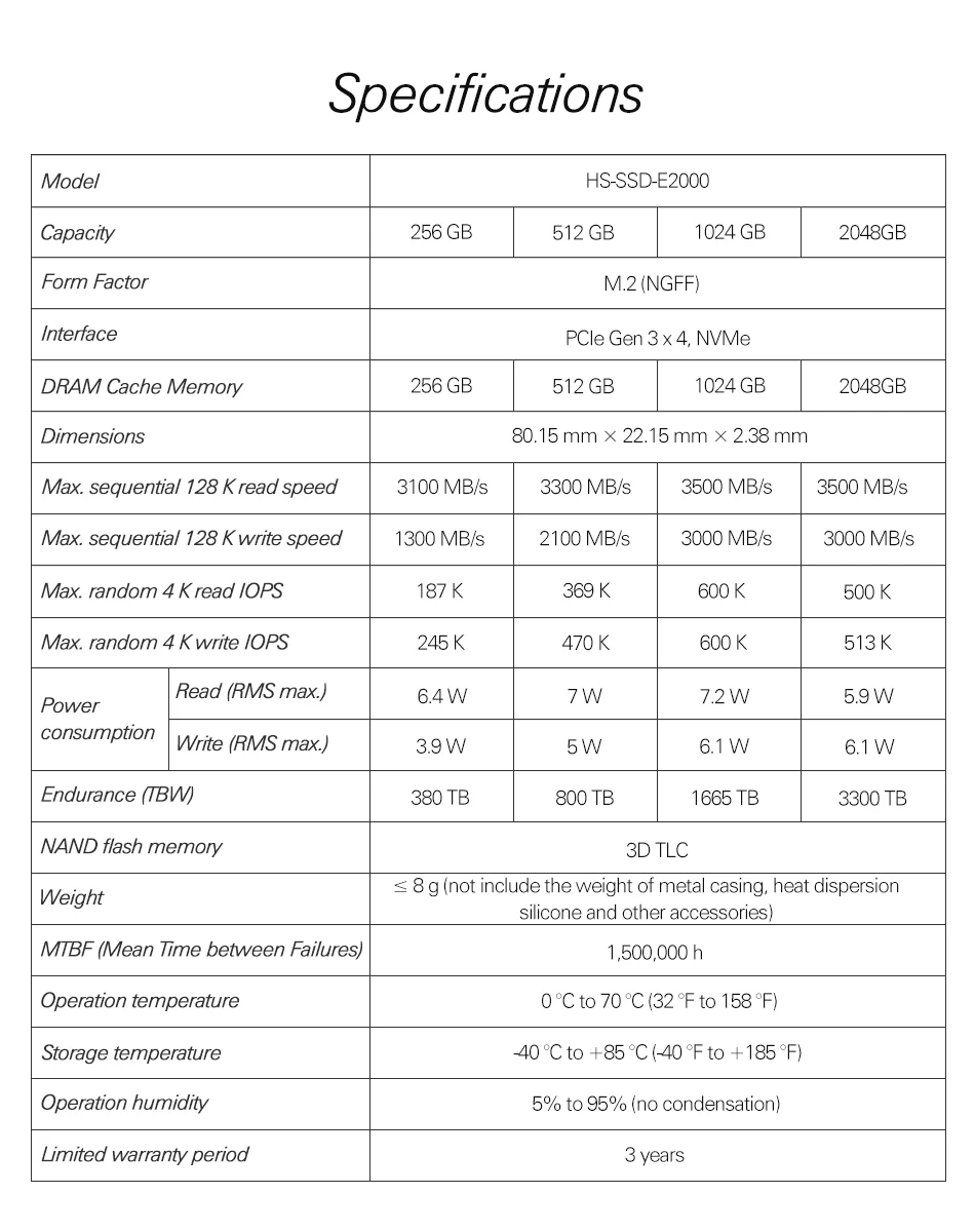 Потребительский SSD E2000 принимает интерфейс M.2, улучшенный чип управления SSD и 3D NAND flash для эффективного улучшения скорости R/W и обеспечения безопасности данных. Это относится к персональному компьютеру и маленькому прокси-серверу для обеспечения стабильного и высокоскоростного обслуживания. Это также может улучшить игровой опыт высокого класса и производительность 3D-графического монтажа.