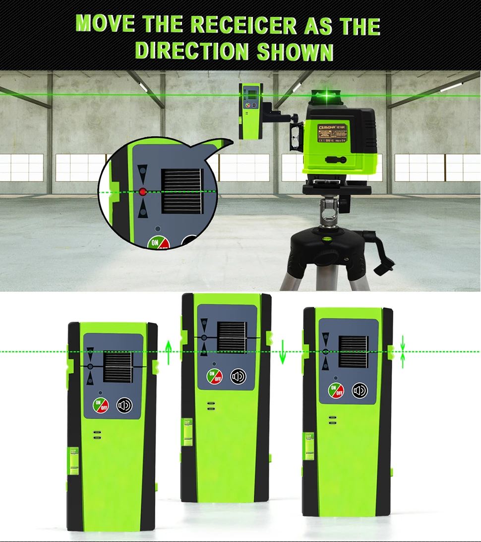 Лазерная линия может быть обнаружена спереди, сбоку и сзади лазерного приемника из-за его множественного функционального дизайна.