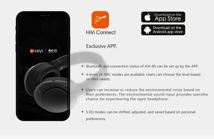 Высокопроизводительный через двухканальный сигнал, цифровой технология АНК. Многоканальное независимое сверхвысокоскоростное DSP ADI; Двойная скорость; Двойная эффективность, несколько режимов шумоподавления для различных условий. Магнитная Беспроводная зарядка hedset. Серия HiVi PB используется для беспроводной зарядки. Четкий для синхронного общения и прослушивания звука Уникальный режим прозрачности: усиливает аудиовыход, одновременно сокращая громкость музыки до 20% Высокопроизводительные двухканальные отзывы, дизайн ANC AW-85 ЗАВОЕВАЛИ НАГРАДЫ CES Innovation в 2019 для своей превосходной качество звука. Его основной дизайн отличается режимом прозрачности, беспроводной зарядкой, управлением через приложение, умным воспроизведением/паузой и т. д. Каждый канал имеет DSP для уменьшения шума, что удваивает скорость и эффективность. Чаша имеет несколько режимов шумоподавления и может оптимизировать различные среды, независимо от того, когда вы находитесь в помещении или на улице в автобус или самолет. В драйвере 40 мм используется ультратонкая нейлоновая диафрагма, а также купол с покрытием из циркония, управляемый магнитной системой 10000 Gs. Это приносит нам мощные басы и сбалансированный Полнодиапазонный ответ. Интеллектуальная игра/пауза Оптический датчик точно определяет движение прослушивания. Положите на наушниках, он включен. Удалите его, он перестанет играть. 2-полосная Мощность база Беспроводная зарядка, без запутывания проводов. Зарядка такая же легкая. 2-сторонняя держатель с функцией беспроводной зарядки: магнитное зарядное устройство для наушников сверху, а также основа для того, чтобы можно также использовать для зарядки мобильного телефона. Прозрачности режим Аккуратно нажмите на корпус левого канала, чтобы активировать режим прозрачности. С включенным режимом громкость музыки может быть снижена до 20%. Вы сможете услышать окружающий звук и поговорить с другими. Эргономичная оголовье и подушки С валики сделанные из сапоги из PU искусственной кожи, AW-85 предлагает вам обеспечивают комфорт в течение целого дня. Дизайн накладных ушей не только прекрасно блокирует звук, но и позволяет избежать давления на уши. HiVi подключение приложения Приложение HiVi Connect-это система, с помощью которой вы можете настроить свой собственный звук. Вы можете регулировать звук, переключая между 4 режимами интенсивности и 5 режимами эквалайзера. Соединение Bluetooth также можно управлять с помощью этого приложения.