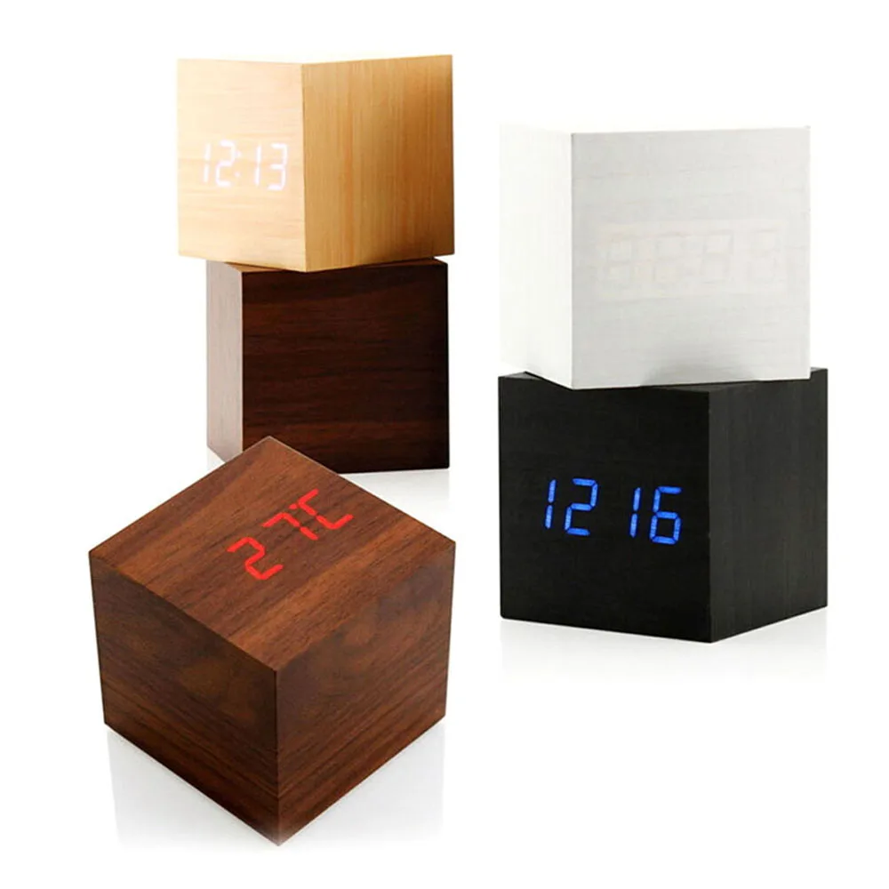Кубик деревянные бамбуковые часы цифровой светодиодный стол будильник термометр Звуковое управление Светодиодный дисплей календарь измеритель влажности
