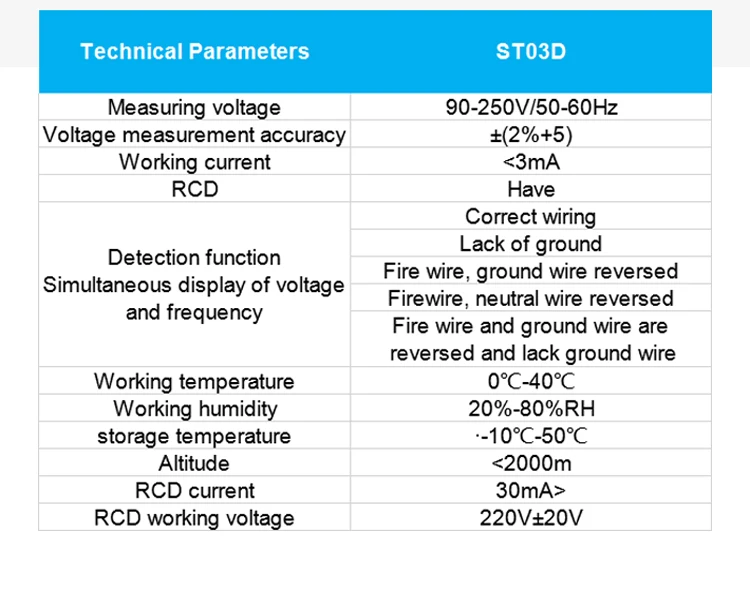 Модель: ST03D ЕС Разъем тестер Материал: ABS Цвет: черный измерительное напряжение: 220-250 В 50-60 Гц (опционально) точность измерения напряжения: ±(2% + 5) Рабочий ток: <3 мА Код: Да функция обнаружения отображает напряжение и частоту: правильный, недостающий земли, недостающий нейтральный, живой нейтральный обратный, живой Заземленный обратный, Рабочая температура: 0 ℃ ~ 40 ℃ Рабочая влажность: 20% ~ 80% RH Температура хранения: -10 ℃ ~ 50 ℃ Высота: <2000m ток RCD: >30mA код Рабочее напряжение: 220V + 20V посылка Размер: 67*60*45 мм/2,6*2,4 * 1.8in посылка Вес упаковки: 95 г/3,4 унции