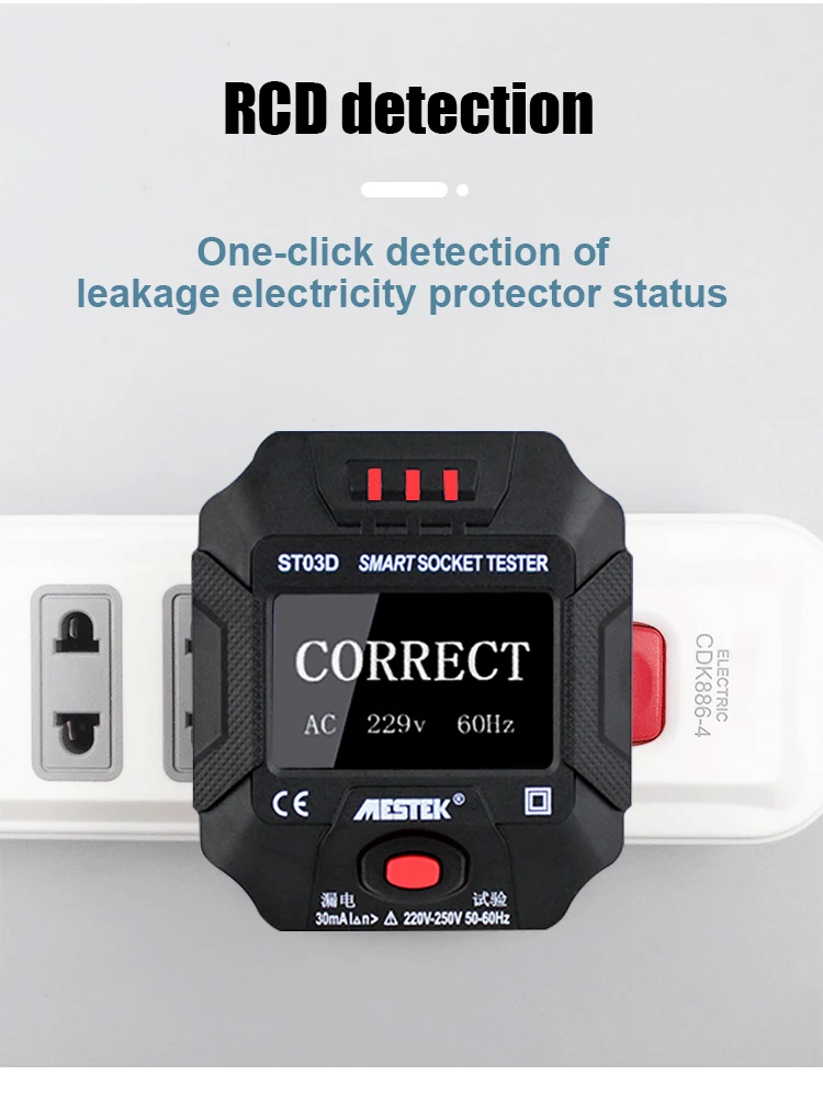 Интеллектуальное обнаружение для обеспечения безопасности бытовой электроэнергии. RCD тест, один ключ обнаружения статуса протектора утечки. В качестве общего инструмента измерения и широко используется в школе, лаборатории, фабрике и других социальных областях. Легкий и удобный размер, легко носить с собой и хранить. С тремя индикаторами и ЖК-экраном его легко использовать. Программа имеет шесть состояний, но может отображаться только одно состояние: правильное, недостающее место, отсутствие нейтрального, живое нейтральное обратное, живое заземление обратное, живое заземление обратное и amp; недостающая земля. Напряжение и частота отображаются на нижней части жк-экрана.