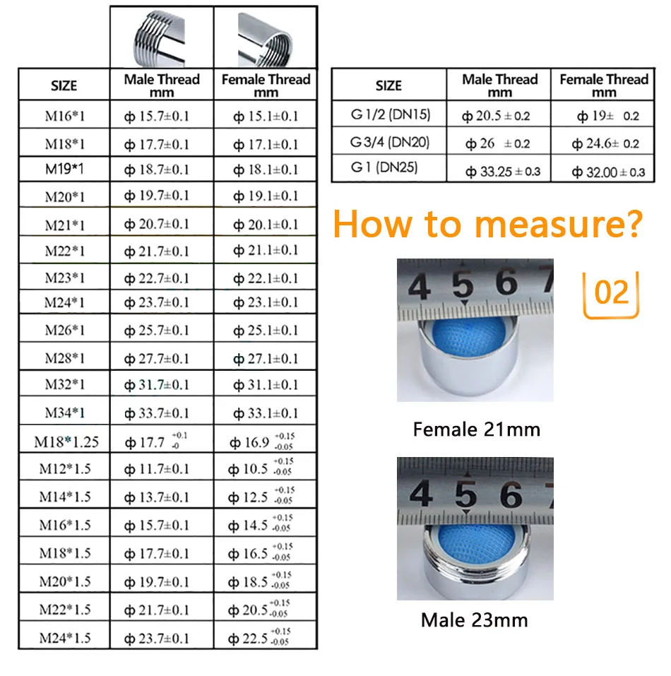 Шаг 1: Убедитесь, что тип вам нужен. Мужская нить или Женская нить. Шаг 2: Измерьте кран, как показано в таблице (на рисунке). Шаг 3: Найдите размер из таблицы (изображение).