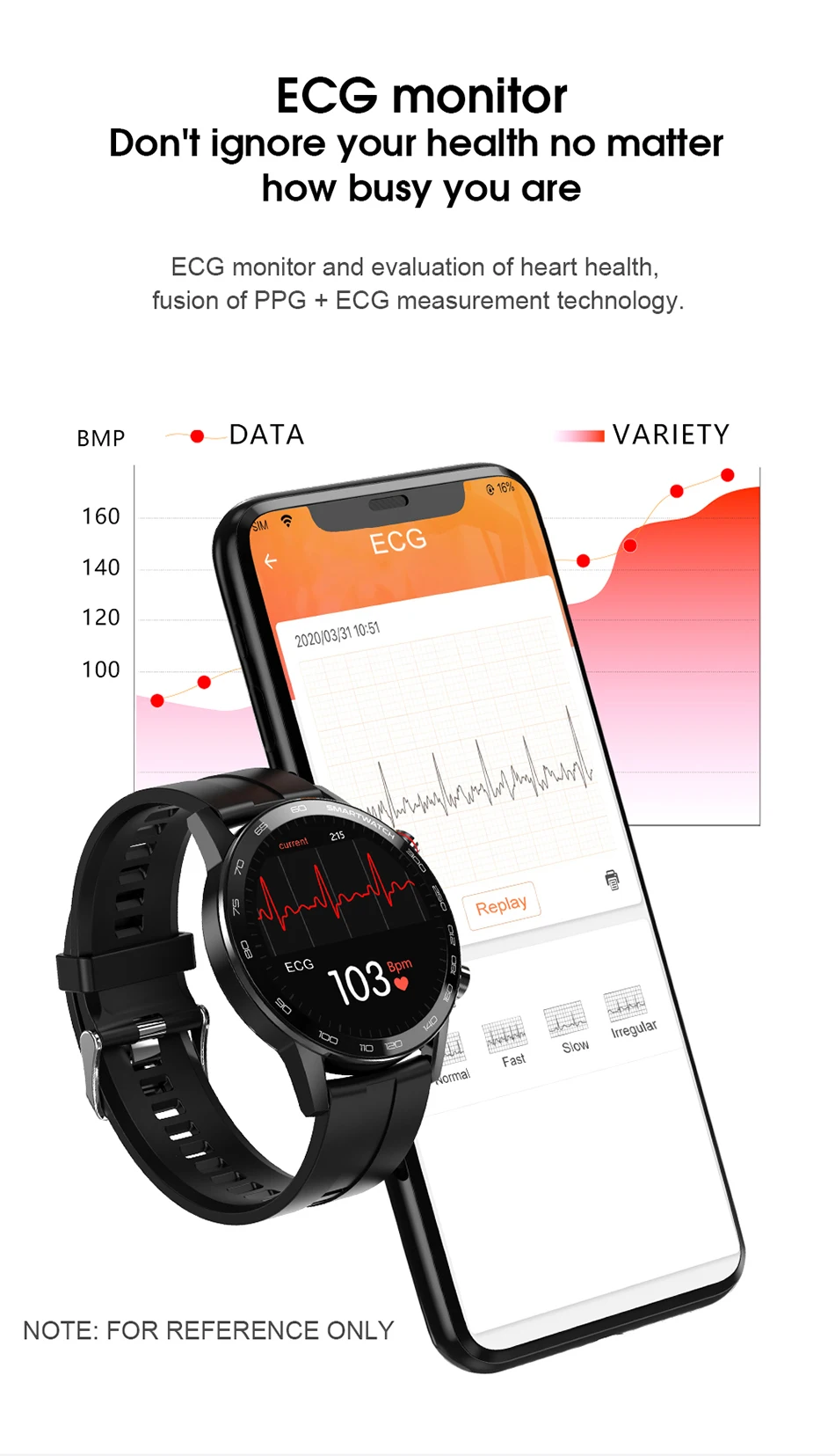 * Основные характеристики : Пульс, ЭКГ, артериальное давление / кислород, шагомер, секундомер, управление музыкой, камера Bluetooth