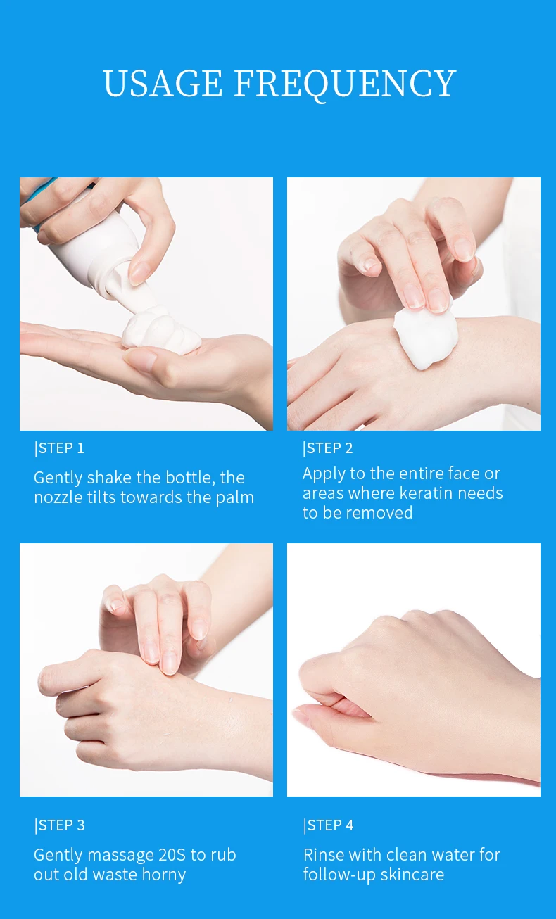 1. Аккуратно встряхните бутылку, насадка наклоняется к ладони 2. Нанесите на все лицо или области, где необходимо удалить Кератин 3. Мягко массируйте 20S, чтобы вытереть старые отходы 4. Краску в чистой воде для ухода за кожей
