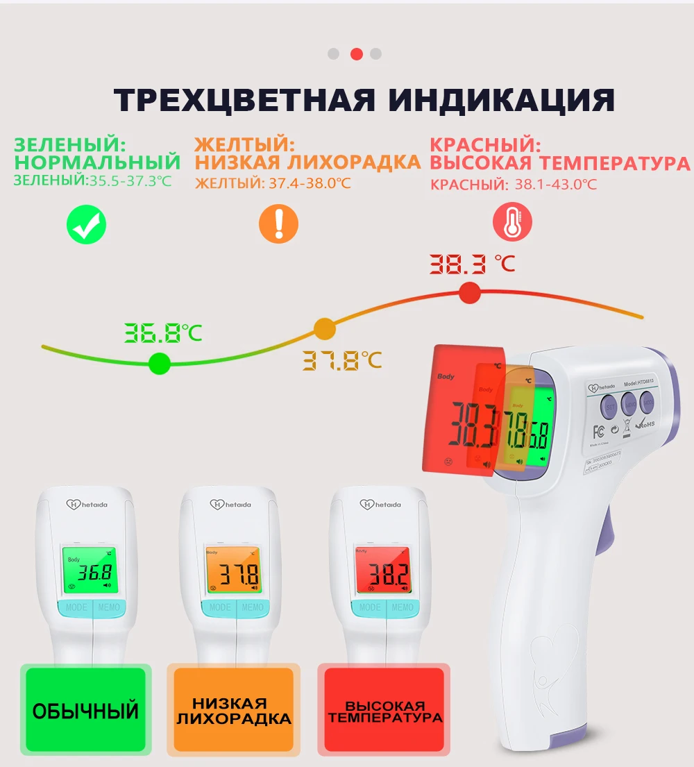 Мы все знаем, что лихорадка является одним из симптом гриппа/простуды, поэтому мы разработали 3 цветную подсветку и функцию будильника с высокой температурой «Звуковой сигнал», чтобы сообщить вам, когда результат температуры превышает нормальный диапазон.