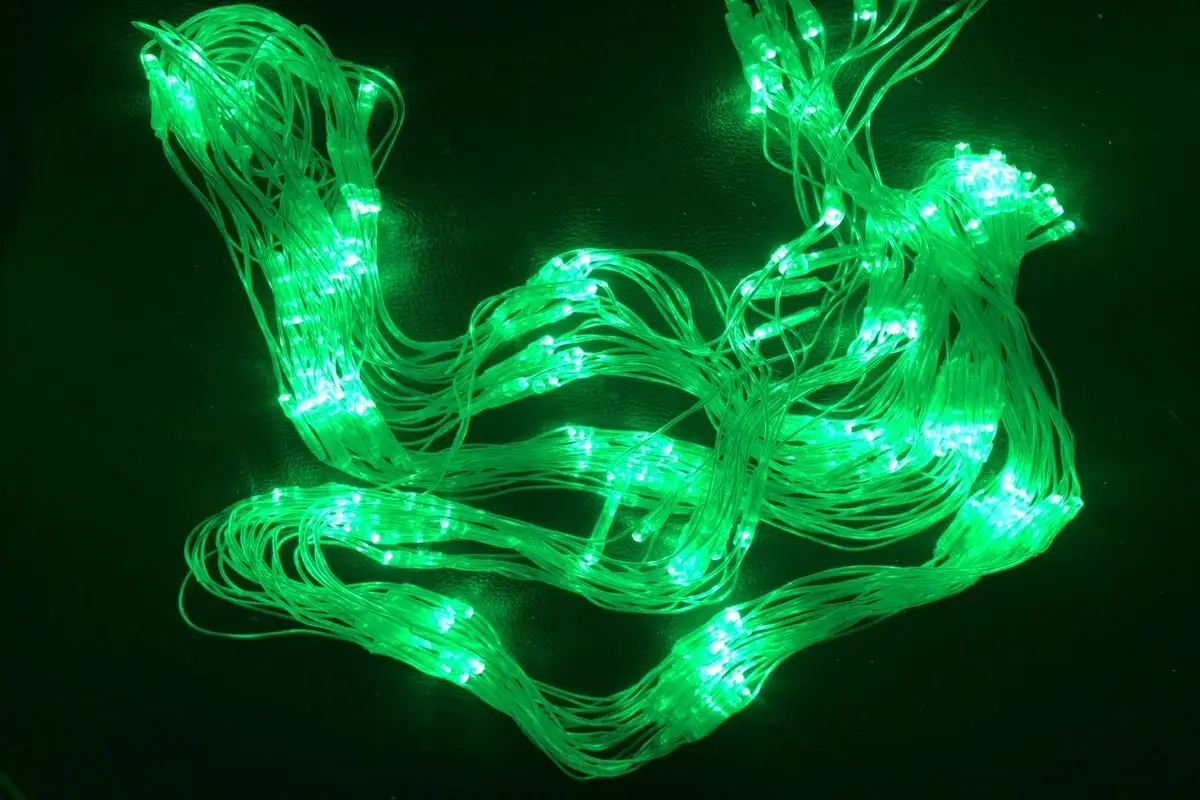 Гирлянда сетка комнатная. Напряжение: 220В, шнур прозрачного цвета, 140 зеленых LED диодов. Это комнатная гирлянда. Вы можете её использовать только в помещении, она не влагозащищённая. С её помощью можно красиво украсить комнату, окно или балкон к новому году.