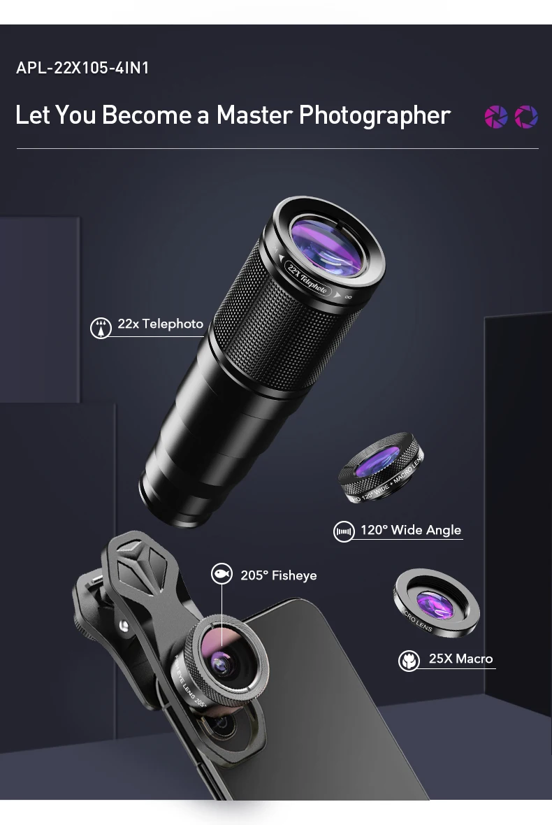 APEXEL 4в1 новый комплект объективов HD для камеры телефона телефото зум монокулярный телескоп 22X Объектив Макро широкоугольный объектив рыбий глаз с дистанционным штативом