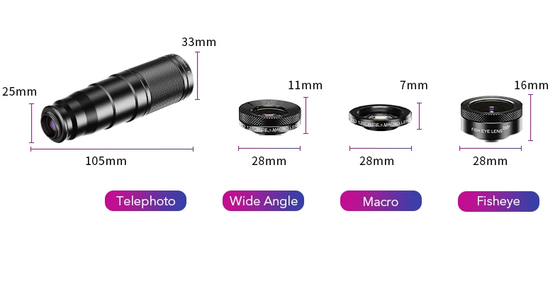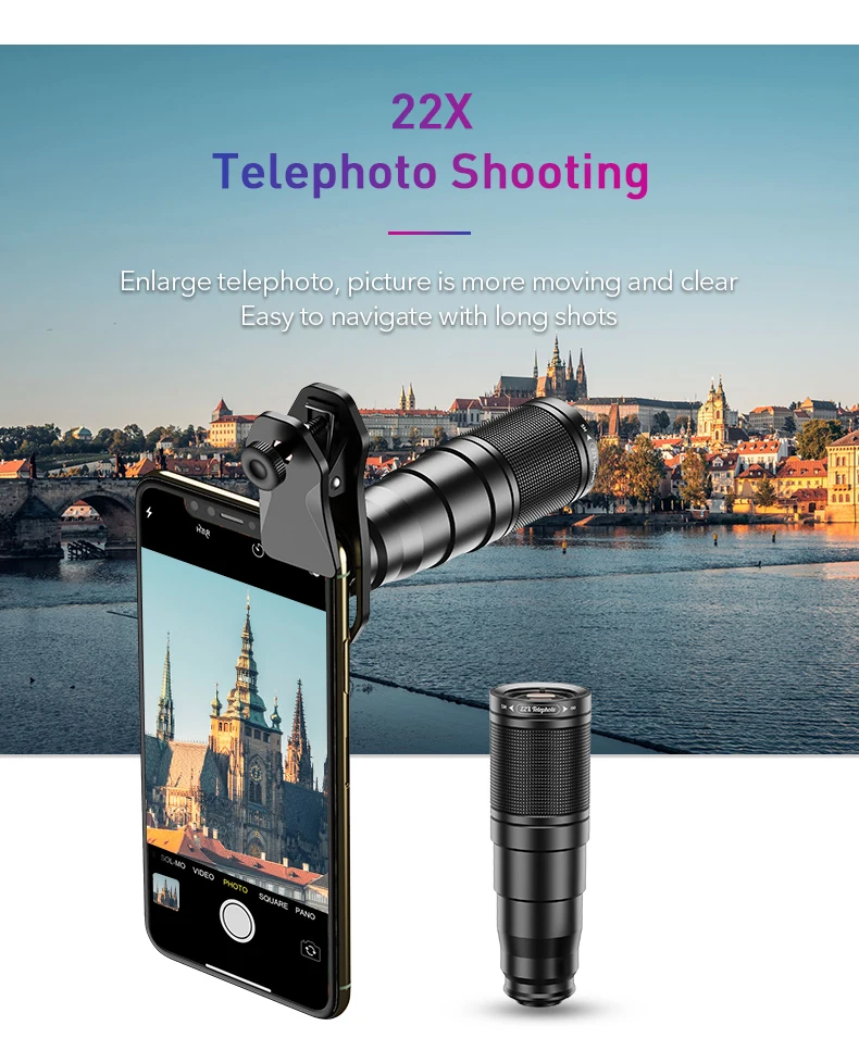 1 x объектив телескопа 22x 1x широкоугольный Макро 120 ° и 25X 2-в-1 объектив 1x205 ° объектив рыбий глаз 1 x зажим для объектива 1 x Серебряный штатив-Трипод 1 x Флип-клип Салфетка для протирки (1 шт.) 1 х тканевая сумка 1 х Инструкция по эксплуатации