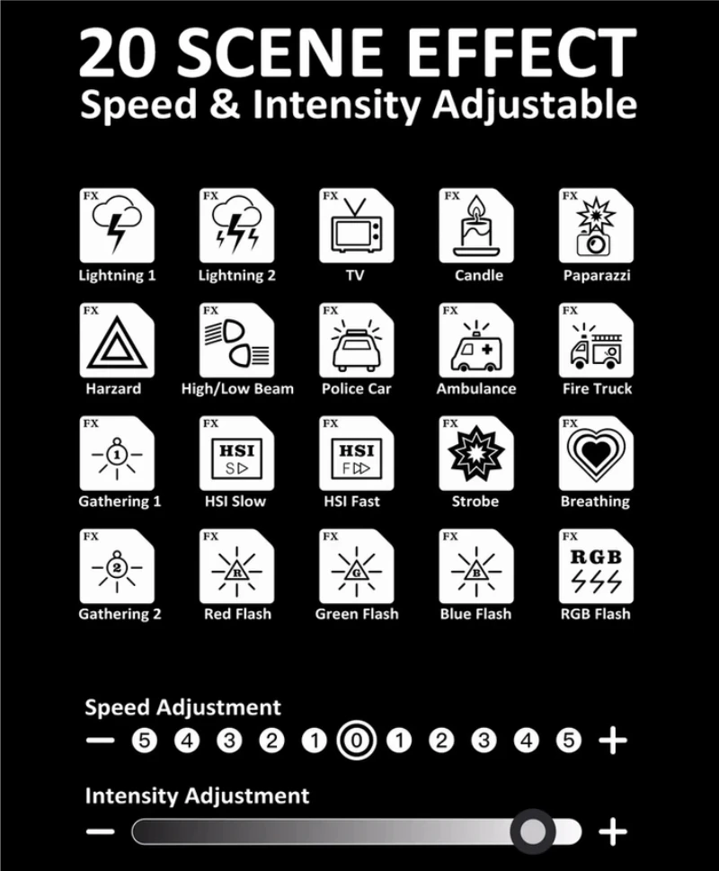 Встроенные приложения с несколькими режимами, в том числе полицейский автомобиль, скорая помощь, пожарная машина, молния 1, молния 2, демонстрация HSI (медленная), демонстрация (быстрая), ТВ-экран, свеча, paparazzi, стробоскоп, дальний/ближний свет, двойная вспышка (Harzard), красная вспышка, зеленая вспышка, синяя вспышка, вечерние лампы 1, Вечерние 2, сердцебиение.