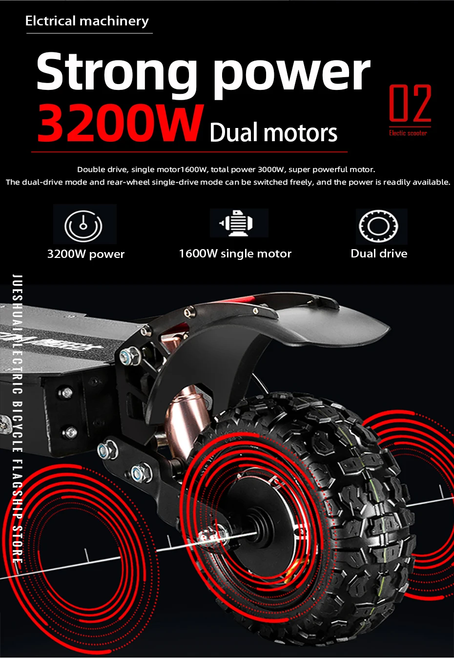 Motor: 60V 2600W (Front 1300W+Rear 1300W, Brushless motorr)/ 60V 3200W (Front 1600W+Rear 1600W, Brushless motor, most powerful)