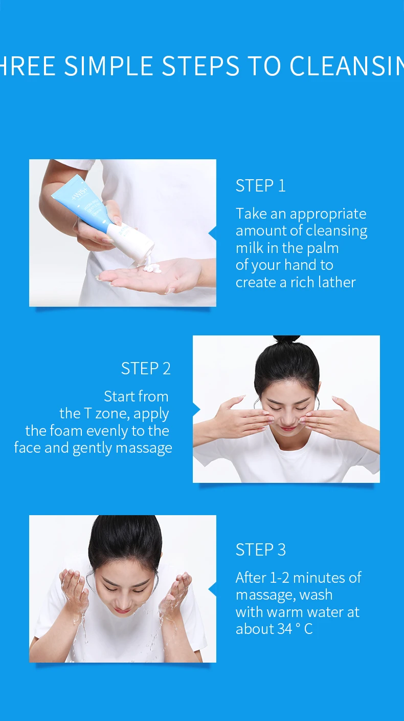 1. Возьмите соответствующее количество очищающего молока на ладони, чтобы создать богатую пену 2. Начните с зоны т, равномерно нанесите пену на лицо и мягко массируйте 3. После 1-2 минут массажа промойте теплой водой при температуре около 34 °C