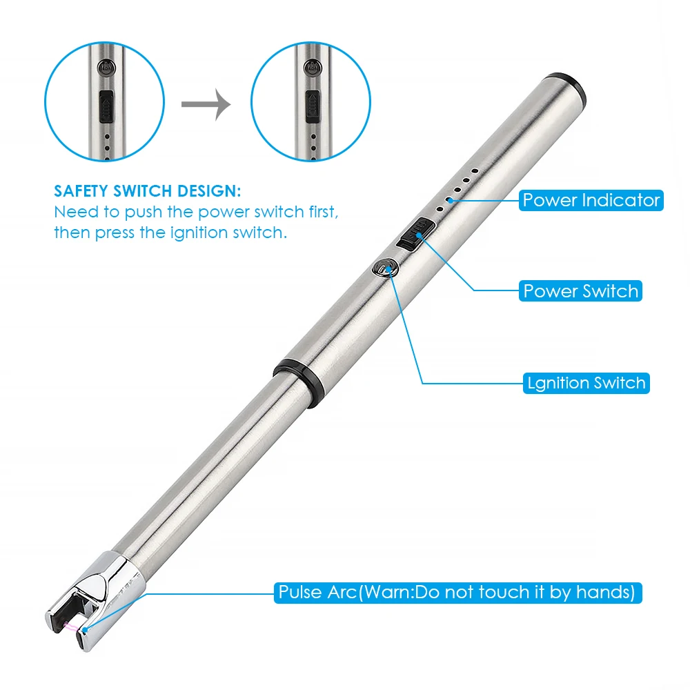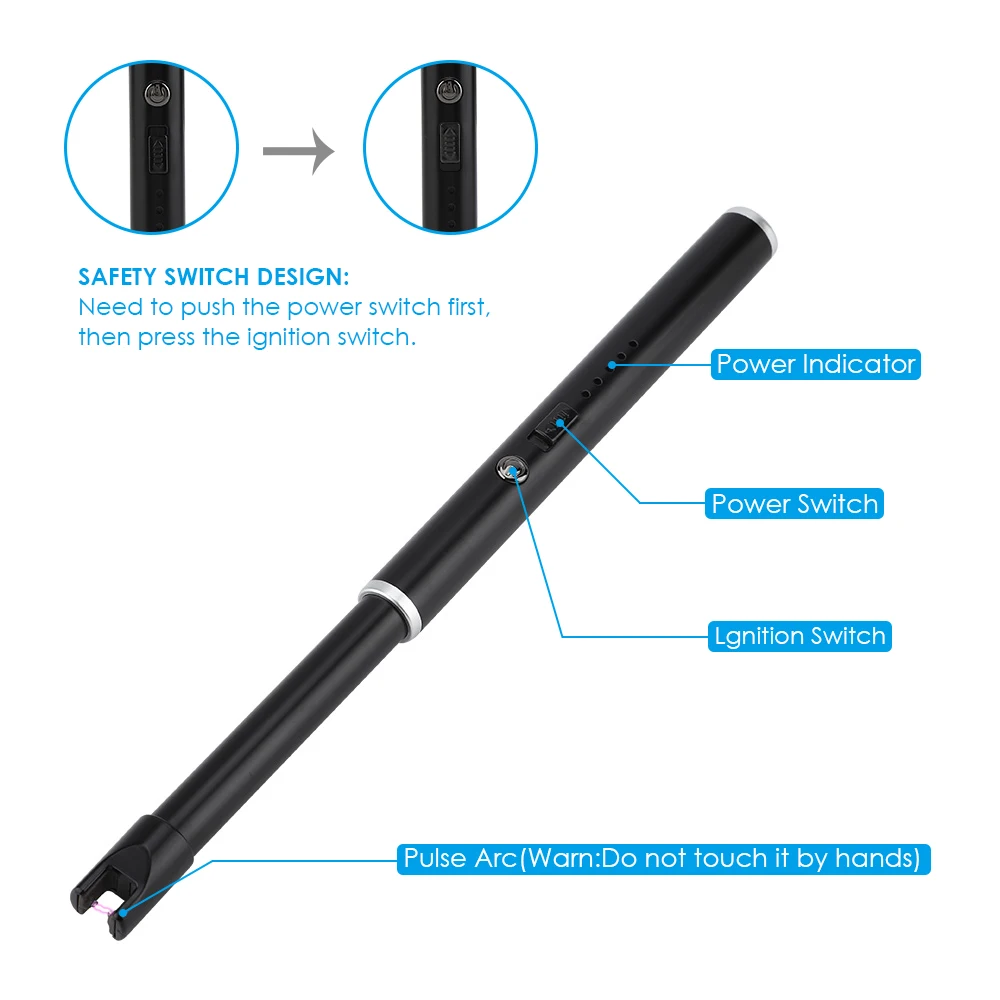 Эта электрическая зажигалка удобна для зарядки через USB. Он имеет переключатель управления двойным зажиганием. Функция автоматического отключения питания делает его энергосберегающим и экономичным. Отлично подходит для барбекю, газа, свечей и других видов активного отдыха.1