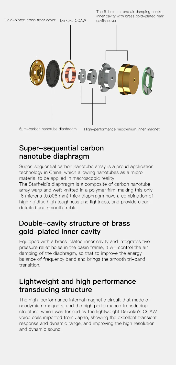 Диафрагма Starfield-это композитная углеродная нанотрубчатая основа и утка, вязанная в полимерную пленку, что делает эту толщиной всего 6 микрон (0,006 мм) диафрагму сочетающейся высокой жесткостью, высокая прочность и легкость, обеспечивает четкость, детализацию и гладкость.
