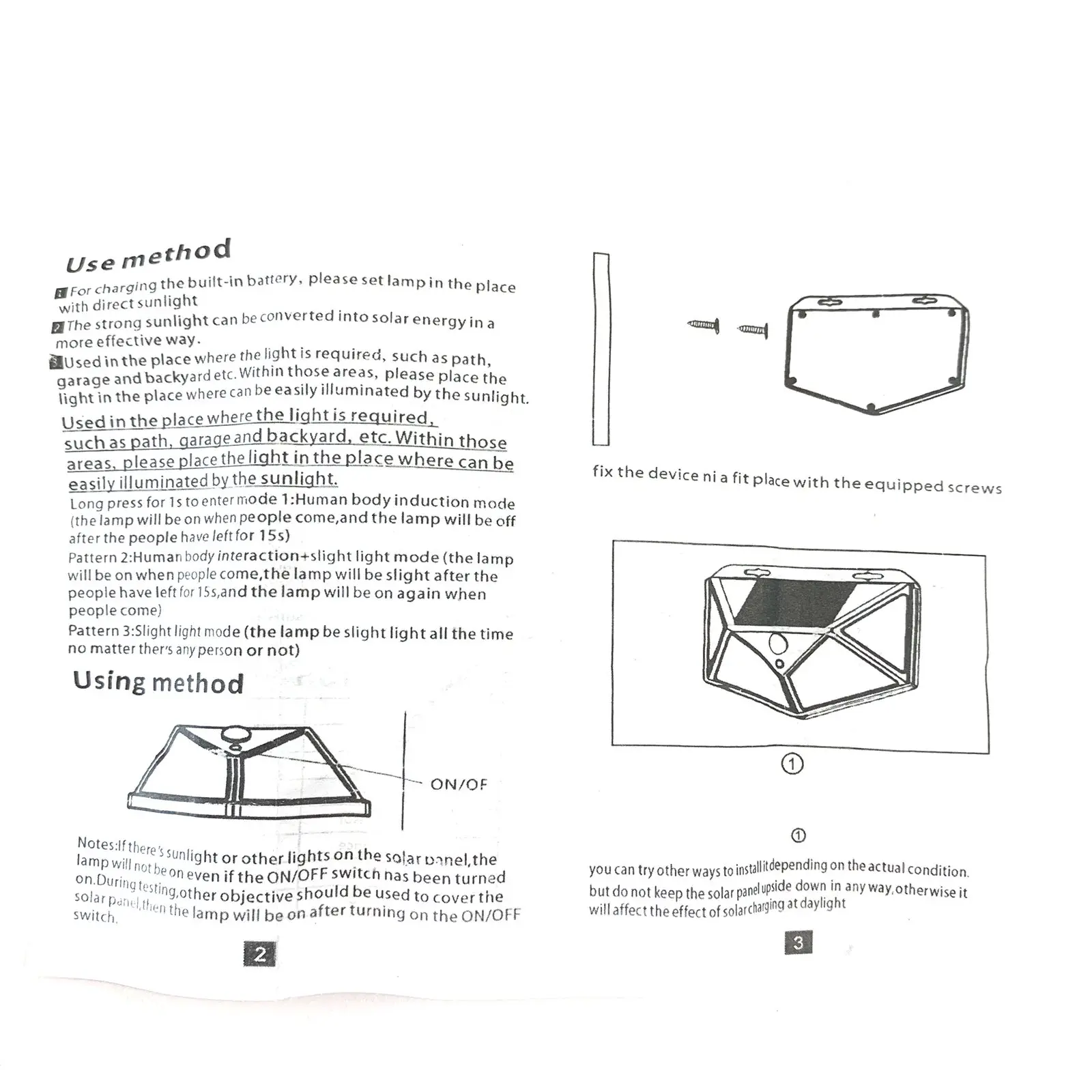 Особенности: Датчик светильник ности с чувствительным датчиком движения/ На солнечных батареях, легко устанавливается Автоматическая идентификация днем и ночью Переключение внутри для экономии энергии во время транспортировки Отличное полезное освещение для вашего сада, двора, прохода, крыльца, патио, подъездной дорожки и т. д. Зарядка от бесплатного солнесветильник и светильник Зеленая энергия, зеленое освещение Корпус из АБС-пластика с защитой от ультрафиолета, не выцветает Характеристики: Тип изделия: светодиодный светильник на солнечной батарее Излучаемый Цвет: белый (6000K-6500K) Кол-во светодиодов: 100 светодиодов Солнечная панель: 0,55 Вт, эффективность 17% Литий-ионный аккумулятор: 3,7 в/1200 мАч Светодиодный Дов: 2835 SMD Ночной Датчик:<10Lux Переключатель: выкл/Авто Водонепроницаемость: IP65 Время зарядки от солнечной батареи: 8 часов. Время работы: 4-8 часов Посылка Светильник 2 винта