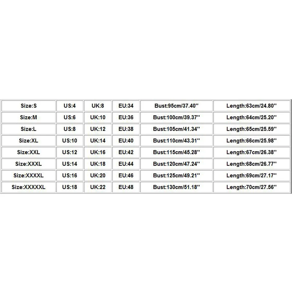 Размеры США UK ЕС Бюст Длина S 4 8 34 95 см/37,40 дюйма 63 см/24,80 дюйма М 6 10 36 100 см/39,37 дюйма 64 см/25,20 дюйма L 8 12 38 105 см/41,34 дюйма 65 см/25,59 дюйма XL 10 14 40 110 см/43,31 дюйма 66 см/25,98 дюйма XXL 12 16 42 115 см/45,28 дюйма 67 см/26,38 дюйма XХХL 14 18 44 120 см/47,24 дюйма 68 см/26,77 дюйма XXXXL 16 20 46 125 см/49,21 дюйма 69 см/27,17 дюйма XXXXXL 18 22 48 130 см/51,18 дюйма 70 см/27,56 дюйма
