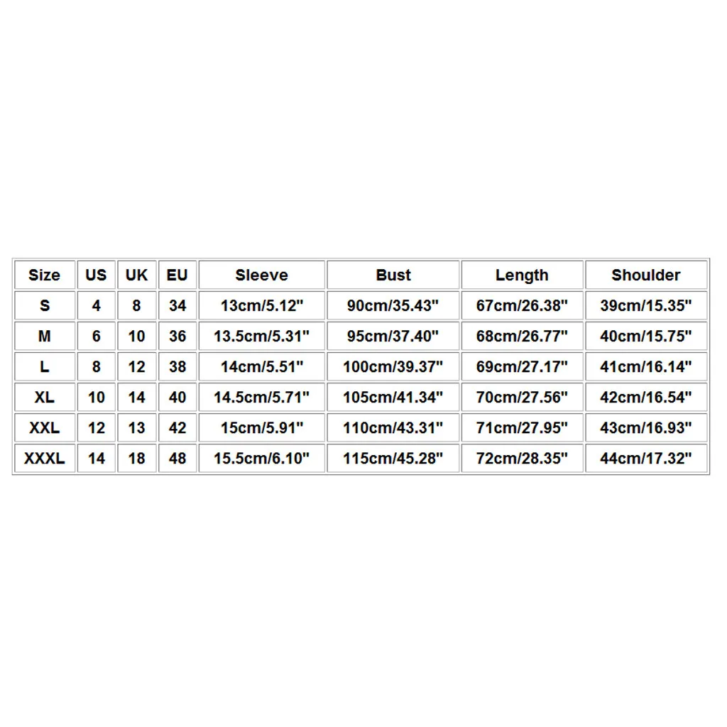 Размер США Великобритания ЕС Рукав Бюст Длина Плечо S 4 8 34 13 см/5,12 дюйма 90 см/35,43'' 67 см/26,38'' 39 см/15,35'' М 6 10 36 13,5 см/5,31'' 95 см/37,40'' 68 см/26,77'' 40 см/15,75'' L 8 12 38 14 см/5,51'' 100 см/39,37'' 69 см/27,17'' 41 см/16,14'' XL 10 14 40 14,5 см/5,71'' 105 см/41,34'' 70 см/27,56'' 42 см/16,54'' XXL 12 13 42 15 см/5,91 дюйма 110 см/43,31'' 71 см/27,95'' 43 см/16,93'' XХХL 14 18 48 15,5 см/6,10'' 115 см/45,28'' 72 см/28,35'' 44 см/17,32''