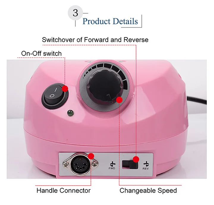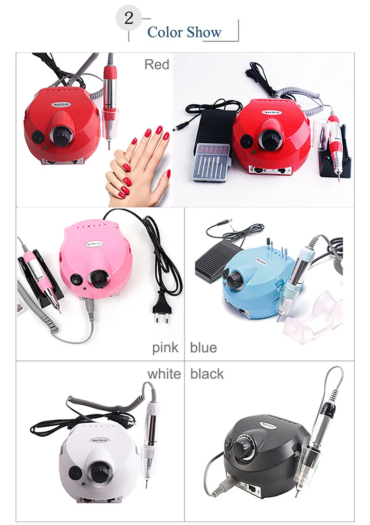 Цвет: белый, розовый, синий, черный Партномер: DM202 Размер продукта: 15*9,2*8,2 см Товары G.W:1200 г Мощность: 45 Вт Происхождение: Гуанчжоу, Китай Сертификат: CE скорость вращения: 0-35000 об/мин Тип: электрические сверла для ногтей Funtion: профессиональная машина для маникюра