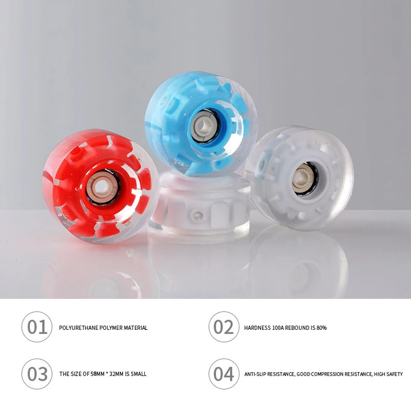 1. Мигание: светящиеся мигающие роликовые скейт колеса дадут вам большой визуальный опыт. Отлично подходит для дерева, бетона и внутренней плитки и т. Д. Поверхностей. Подходит для двухрядных роликовых коньков, скейтборда.