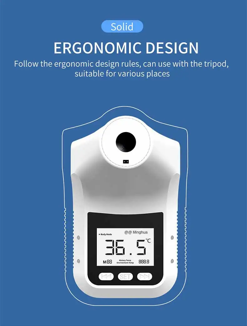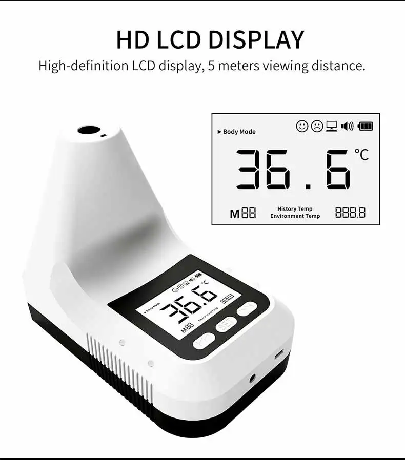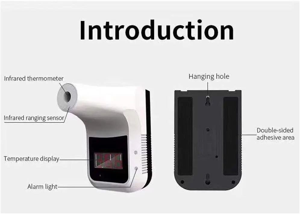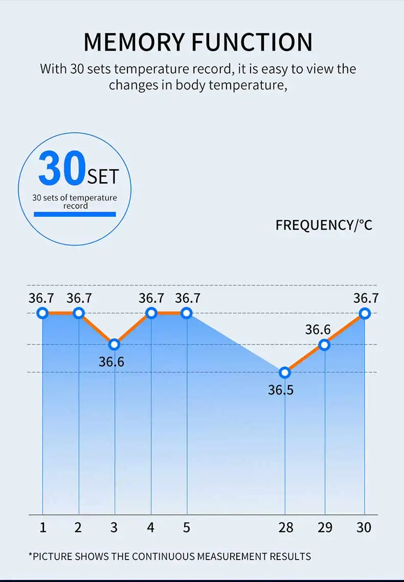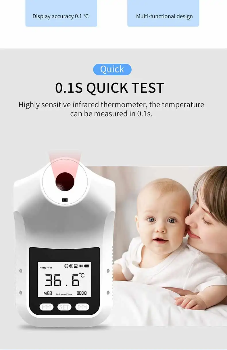Экран: цифровой ЖК-дисплей Время отклика: 0,1 s Точность тестирования: ± 0,2 градусов Способ зарядки: зарядка через USB или портативные зарядные устройства Диапазон инфракрасного измерения: 0 ~ 50 ℃ Автоматическая сигнализация: мигающий красный светильник + звук «Di». Автоматическое измерение: расстояние измерения 5-10 см
