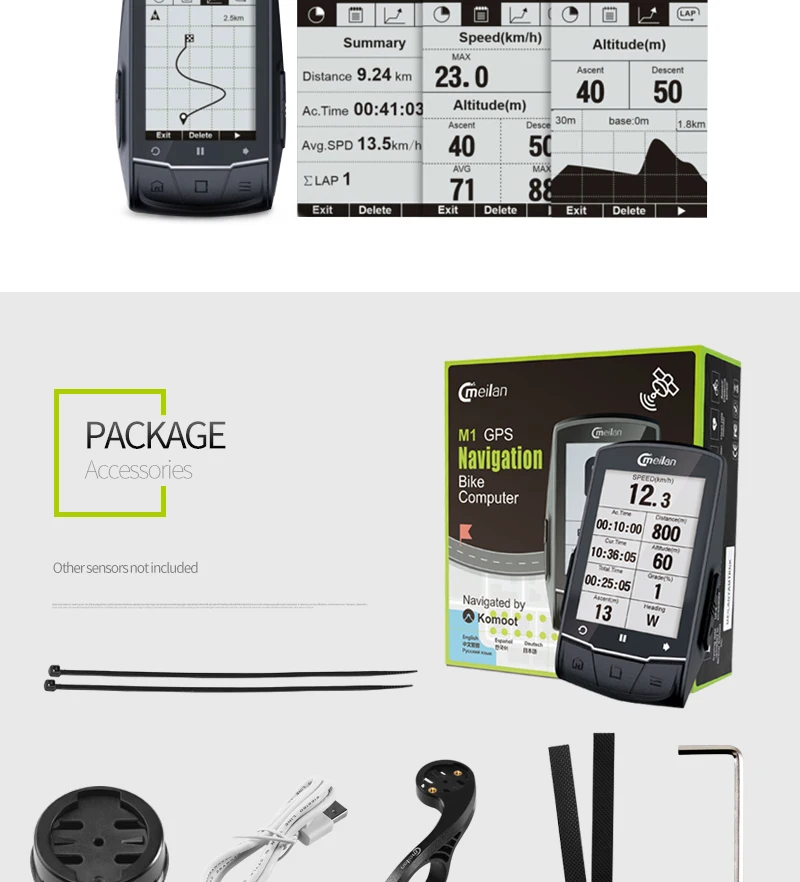 1. 2,6 дюймов высокой четкости точечная Матрица экрана, белая подсветка, антибликовое покрытие технологии, видимый со всех сторон под прямыми солнечными лучами; 2. Встроенный высокоточный GPS чип; Перезаряжаемая батарея емкостью 3,1200 мАч; Может работать 40 часов без подсветки. 4. Технология BLE4.0 может быть соединена с беспроводным датчиком скорости/пульсометром/счетчиком мощности. 5. Поддержка хранения информации о двух велосипедах; 6. Может отображать более 50 видов данных: высота, давление воздуха, расстояние, каденция, частота сердечных сокращений, мощность и т. д. 7. Страницы могут быть расширены или уменьшены свободно; До 50 видов вариантов данных могут быть выбраны свободно. 8. Множество данных для восхождений: высота, кумулятивный подъем, наклон, VAM, карта высот и т. д. 9. Удобные функции, такие как автоматическая остановка, авто lap и т. д. 10. Данные о езде могут быть сохранены и загружены на спортивные веб-сайты: STRAVA/KOMOOT; 11. Навигация в реальном времени в любое время и в любом месте по всему миру 12. Поддержка многоязычного дисплея; 13. Более практичные функции, такие как управление обучением и конкуренция. 14. Два вида способов фиксации: Удлиняющая рама руля и стержень; 15. Класс водонепроницаемости: IPX6; 16. Размер одной посылка: 120*135*54 мм; Вес: 300 г; Жесткий до нижней коробки; 18. Сертификация: CE. ROHS, FCC;