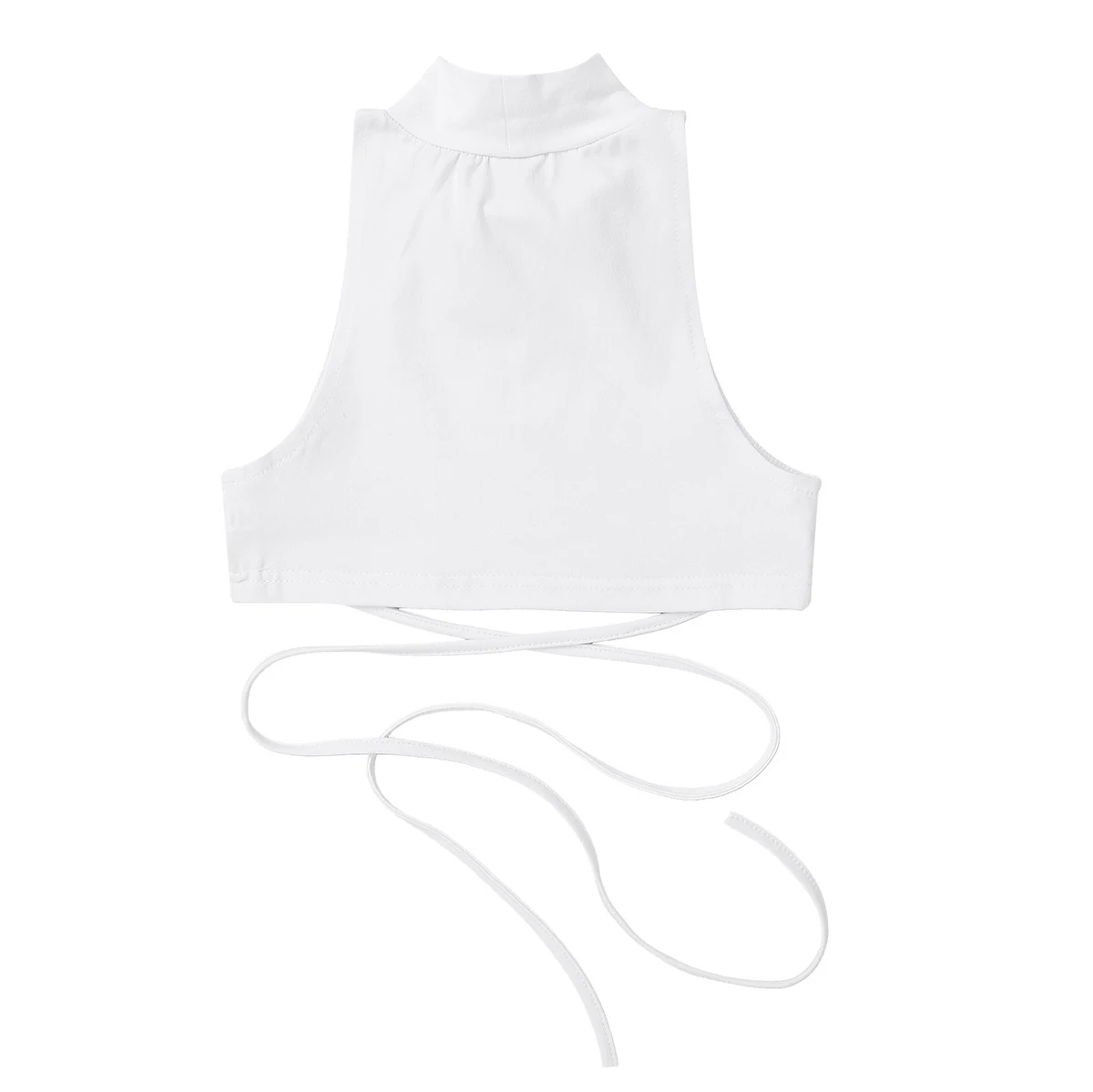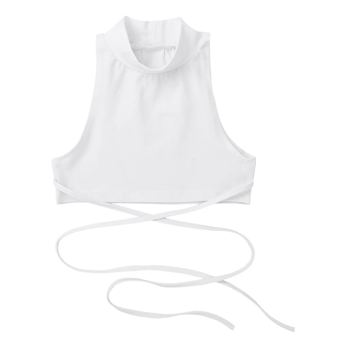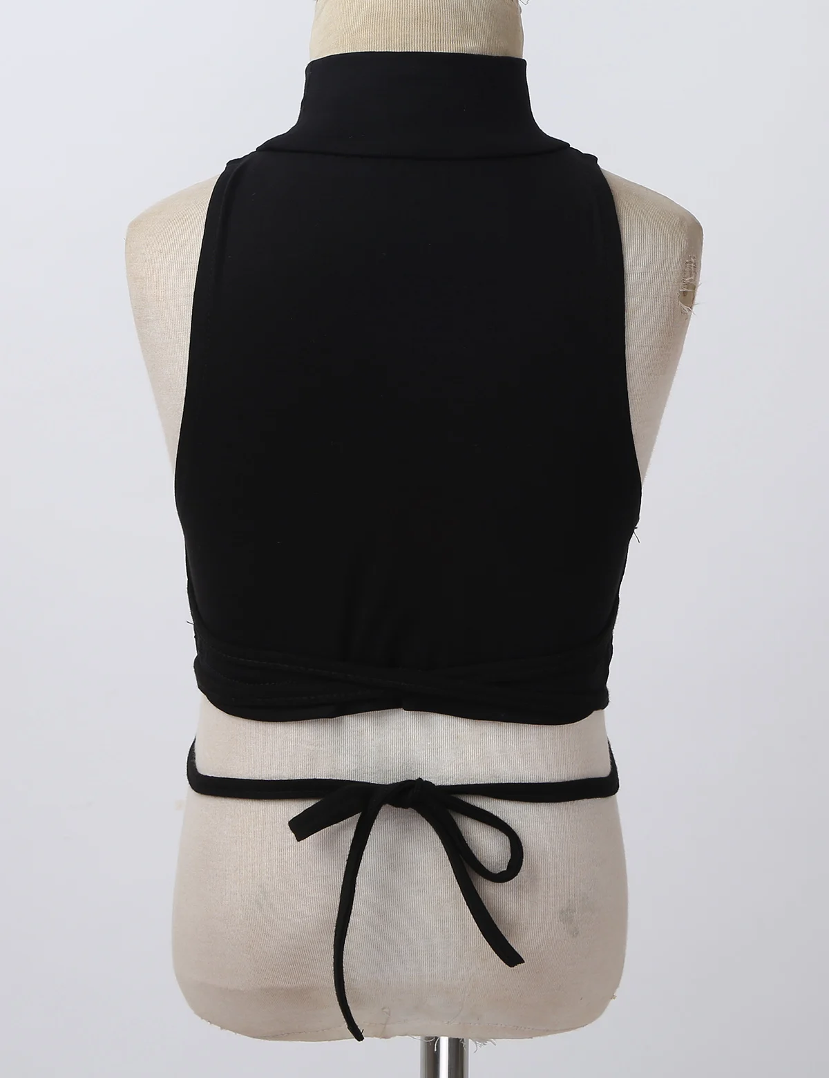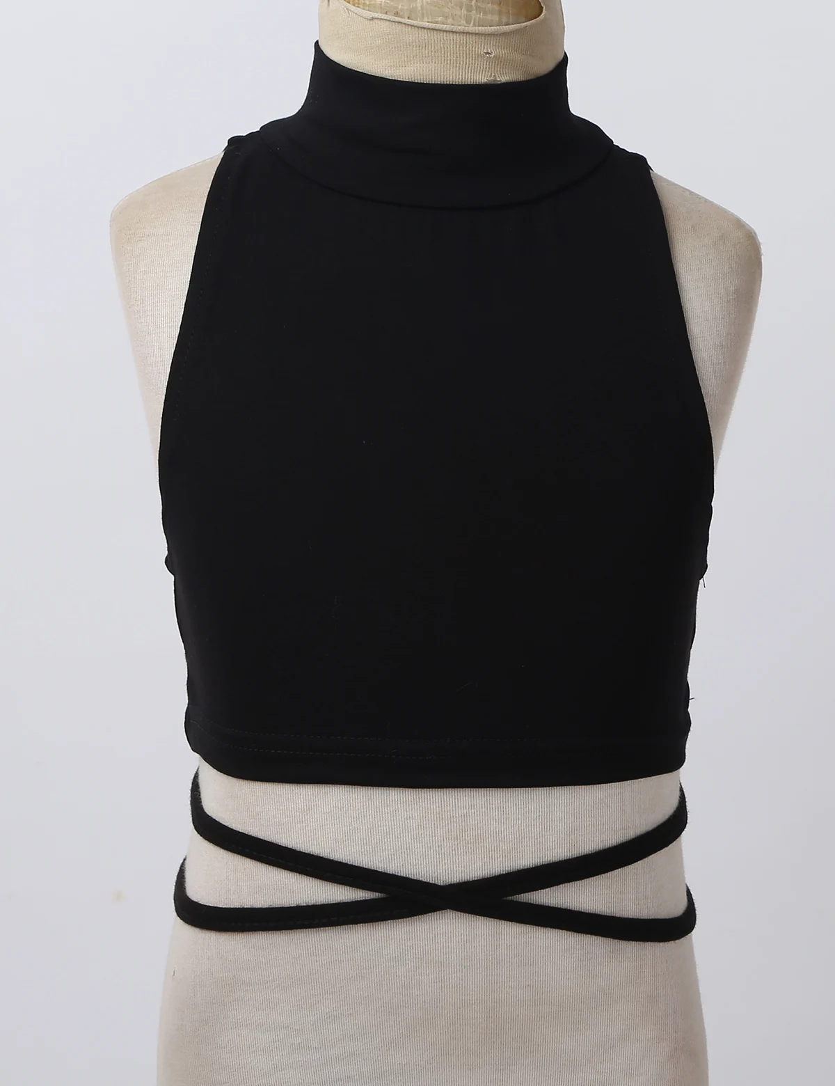 Укороченный топ без рукавов с воротником-стойкой и самозавязывающимися лямками на талии. Однотонный, без застежки.