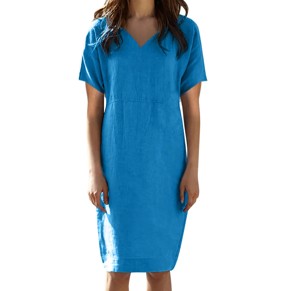 Модное женское летнее однотонное платье макси из хлопка и льна с V-образным вырезом и коротким рукавом