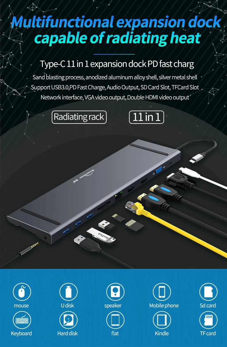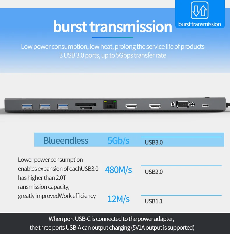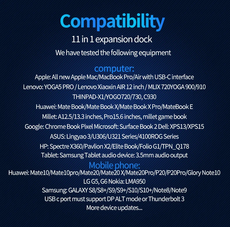 -Модель подходит для: ① один HDMI Тип: USB 3,0*2 + HDMI + VGA + RJ45 + TF/SD + 3,5 мм Jack + PD (10 Порты) -Модель ② двойной HDMI Тип: USB 3,0*2 + HDMI * 2 + VGA + RJ45 + TF/SD + 3,5 мм Jack + PD (11 Порты) Порты Примечание -Разъем HDMI: поддержка 4K/30Hz HD на экране -USB 3,0: передача данных 5 Гбит/с (1G фильм может быть передан за 5 секунд) -Интерфейс RJ45: Поддержка сети Ethernet 1000 Мбит/с -Устройство для чтения карт SD/TF: не поддерживает одновременное считывание карт TF и sd-карт -3,5 мм Aux Jack: подходит для наушников Динамик -Порт типа C PD: порт поддержки 60 Вт PD зарядка (макс.) -Функция: USB 3,0, HDMI,VGA,RJ45,SD/TF кардридер, PD зарядка usb-хаб Полезные советы: 1) Пожалуйста, предоставьте источник питания при подключении к энергоемким устройствам. 2) из-за большого энергопотребления жесткого диска, если на жестком диске обнаружился сбой чтения, пожалуйста, используйте подключение к зарядному устройству для источника питания 3) из-за ограничений системы Mac OS MacBook не может поддерживать раздельный дисплей на 3 разных дисплея. 4) система Windows 10/Windows 7 может быть разделена на 3 разных дисплея. 5) Разрешение видеовыхода составляет 1080P/60 Гц, в то время как HDMI и VGA работают одновременно. 6) Разрешение видеовыхода 4K/30Hz, в то время как два HDMI работают одновременно. 7) не поддерживает симуляционное считывание tf-карты и sd-карты. 8) концентратор может нагреваться при использовании, пожалуйста, не волнуйтесь, это нормально и не влияет на работу.