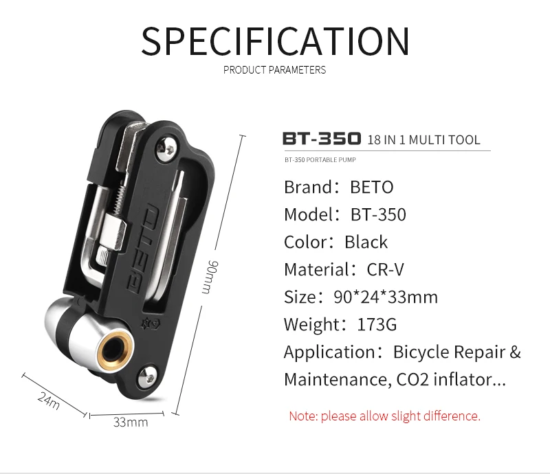 18 в 1 мульти инструменты и СО2 надувной насос Изготовитель: Beto Спецификация: * Модель: BT-350; Вес: 173 г; Материал: CR-V; Размер: 90x24x33 мм; * Происхождение: Тайвань, Китай; * Инструменты в комплекте: шестигранный ключ 2,2.5,3,4,5,6,8 мм; Филлип/плоская отвертка; Ключ Torx 25; Гаечный ключ с открытым зевом 10 мм, спицевый ключ 3,23, 3,3, 3,45, 3,96 мм; Спицевый ключ для Mavic. Удаление цепи; Применение: ремонт и обслуживание велосипедов, СО2 надувной... Особенности: * Запатентованная инновационная 4-сторонняя лампа-открытого дизайна; * Легкое сцепление/компактный размер; * Сопло СО2 подходит для schrader/Presta;