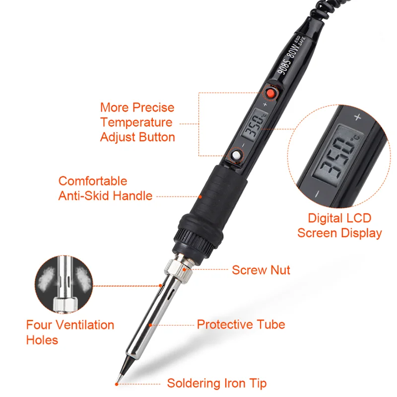 908S 80 Вт Электрический паяльник 110 В 220 В с регулируемой температурой ЖК-сварочный паяльник Комплект для ремонта дома паяльник инструменты Характеристики паяльника: Напряжение: AC220-240V или AC100-130V Мощность: 80 Вт Частота: 50 Гц/60 Гц Диапазон температур: 180 ~ 500 ℃/356 ~ 932 ℉ Стабильность температуры: ± 1 ℃ Тип нагрева: Wmore керамический элемент Наконечники паяльника: 900M-B1.2 Длина провода: 1,4 м/55,12 дюйма Размер паяльника: Approx.242 * 25*25 мм/9,6*0,98 * 0.98in Вес паяльника: Approx.96g/3,4 oz Размер посылка: прибл. 254*55*35 мм/10*2,2 * 1.4n Вес посылка: прибл. 139 г/4,9 унций