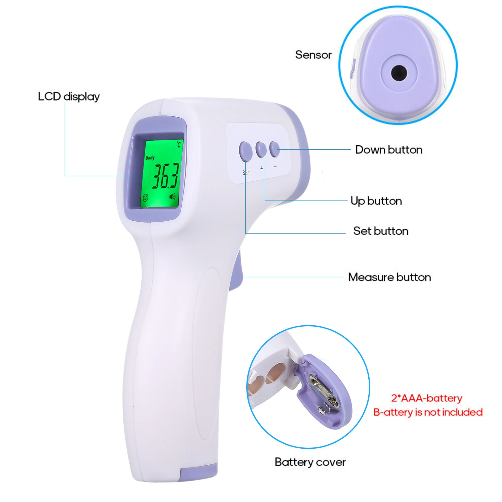 Портативный цифровой инфракрасный термометр отличается простотой в эксплуатации, быстрым измерением и точными результатами. Функции включают в себя лба/объект двойной режим, сигнал тревоги лихорадки, 3 с аккумулятором, Трехцветная подсветка, Автоматическое отключение питания, и т. д. Подходит для измерения температуры детей, малышей, детей и взрослых дома или в других общественных местах.