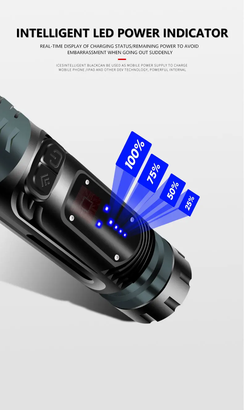 Световой индикатор: 1. При зарядке индикатор батареи мигает снизу вверх, а четыре синих фонаря всегда горят при полной зарядке.