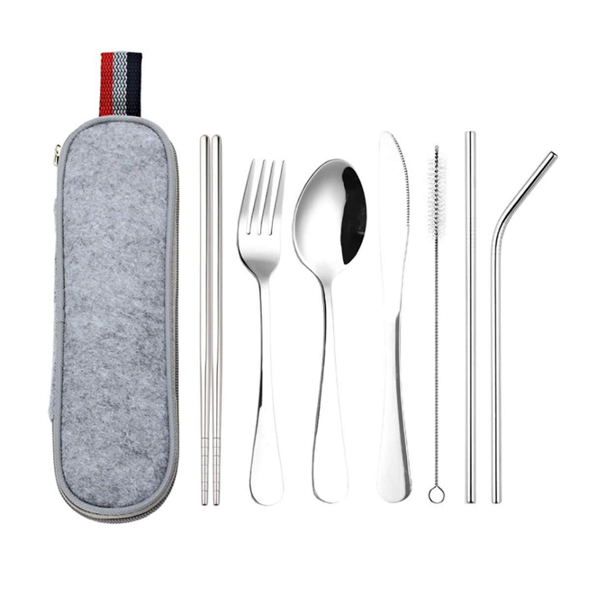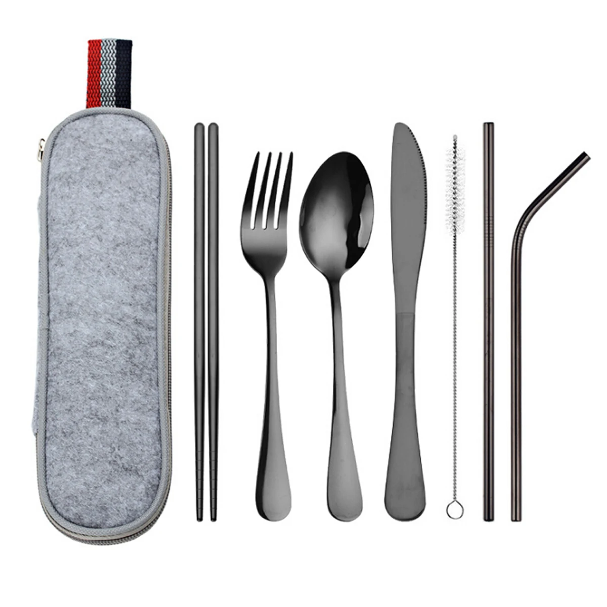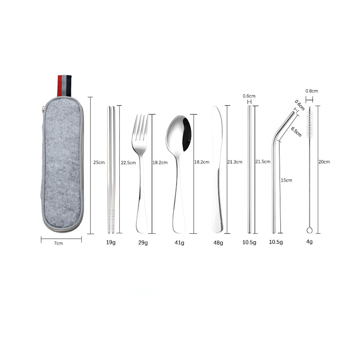 Упаковочный лист: нож * 1 + ложка * 1 + вилка * 1 + палочки для еды * 1 + прямая труба * 1 + налокотная труба * 1 + щетка * 1 + переносная сумка для посуды * 1