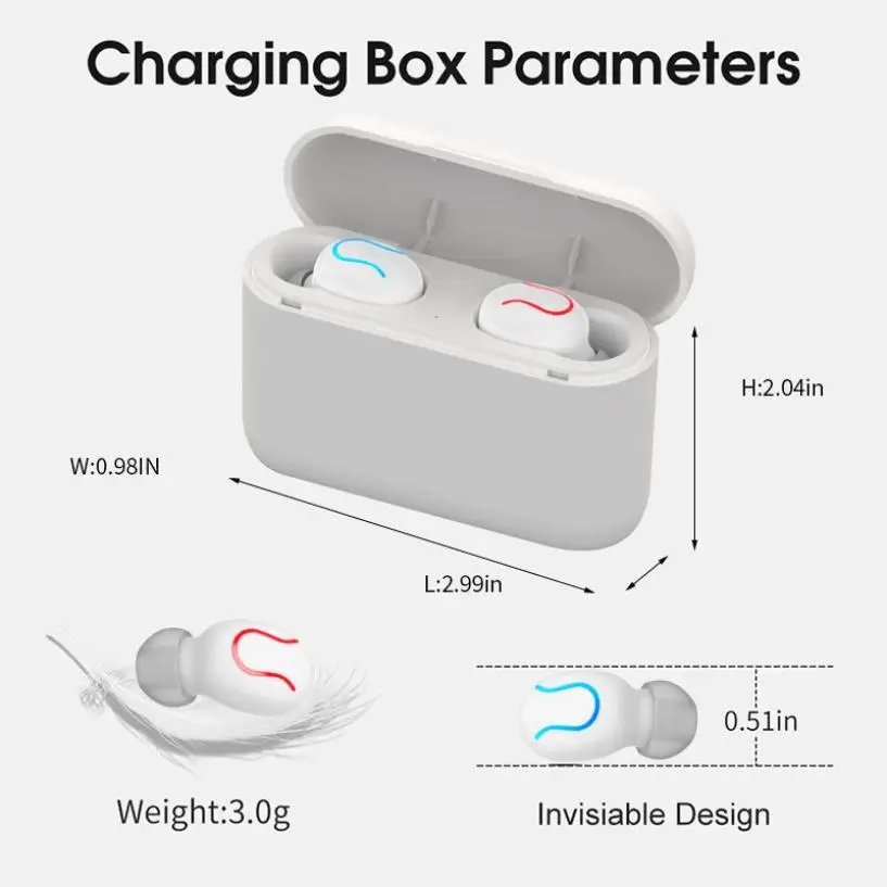 Основные характеристики: 1. Чехол для зарядки 1500 мАч, работает как внешний аккумулятор 2. Водонепроницаемость IPX5 3.Bluebooth 5,0 4. Автоматическое включение/выключение, автоматическая пара 5. Время работы в режиме ожидания: 120 ч Параметры гарнитуры ♦Беспроводная версия: V5.0 + EDR ♦Сопротивление: Ф8 мм 32 Ом ♦Чувствительность микрофона:-42 дБ ♦Беспроводная Частота: 2,4 ГГц ♦Емкость аккумулятора наушника: 50MAHx2 ♦Рабочая температура: 10-50 ℃ ♦Напряжение зарядки: 5 в пост. Тока ♦Расстояние передачи: 10 м ♦Время воспроизведения: около 4,5 часов ♦Время зарядки: 1 час ♦Время работы в режиме ожидания: 120 часов ♦Вес: 4 г Чехол для зарядки ♦Входное напряжение: 5 В 1A(TYP) ♦Входной ток: 5 В 1A(TYP) ♦Вес: 69 г ♦Чехол для зарядки: 1500 мАч Продукты включают в себя 1 * одна пара bluetooth-гарнитур 1 * зарядное устройство 1 * зарядный кабель 1 * Руководство пользователя