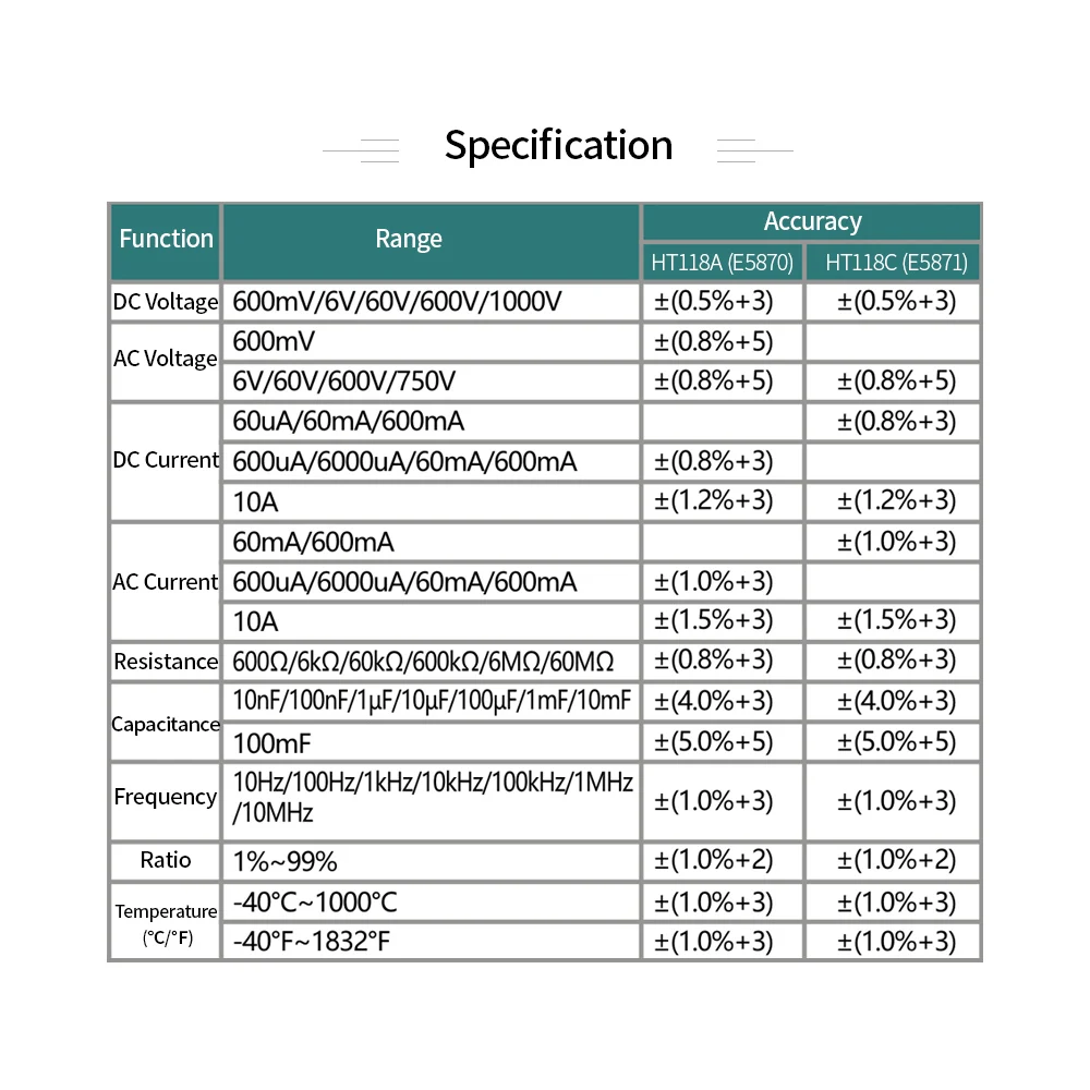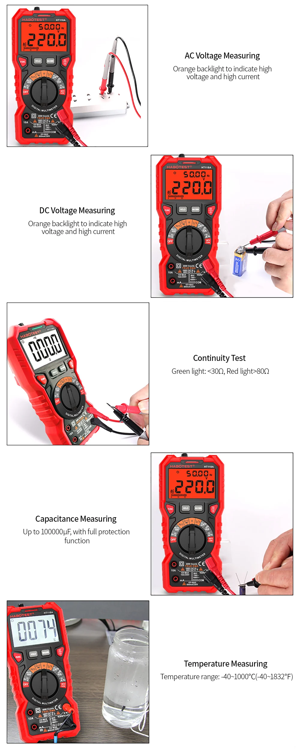 Широкий диапазон измерений: для измерения напряжения постоянного/переменного тока, постоянного/переменного тока, сопротивления, емкости, диодного теста, NCV теста, живого теста, частоты, температуры и т. Д.