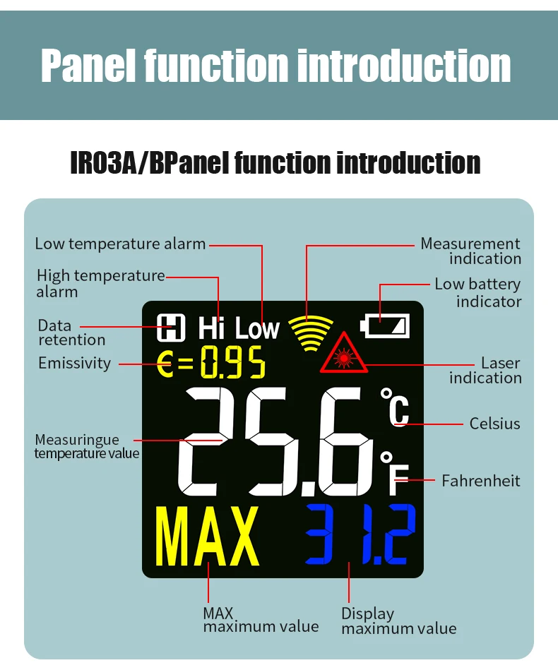 Когда термометр включен, значение измерения по умолчанию является максимальным значением, и непрерывное измерение может блокировать более высокую температуру