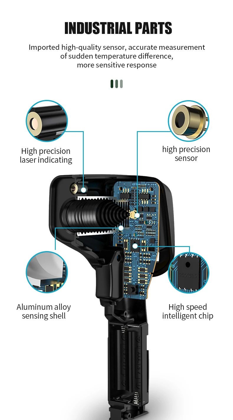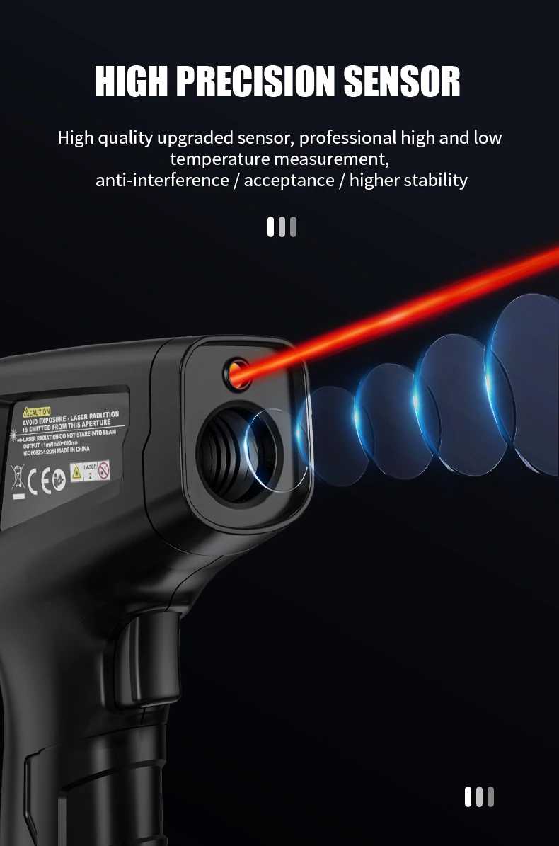 Высокая точность измерения, регулируемая излучательная способность, HD, цветной экран, высокая и низкая температура сигнализации, высокая и низкая температура сигнализации, отношение Расстояния объекта 12 : 1, блок переключатель, сохранение данных, автоматический сон, подсказка низкого заряда батареи